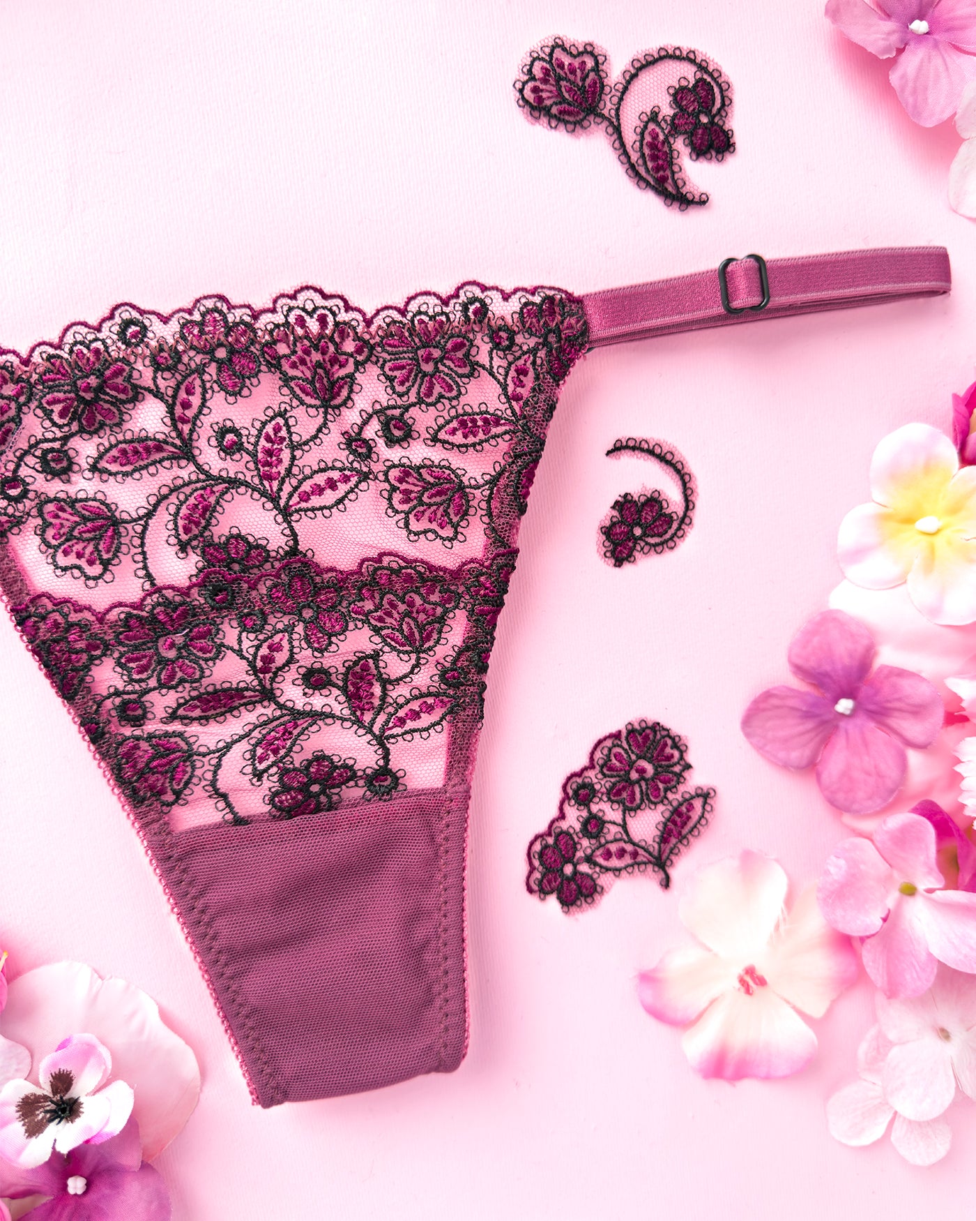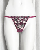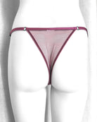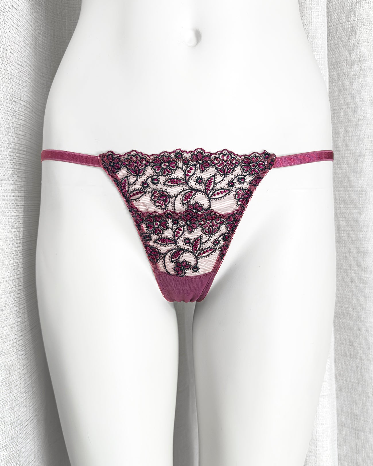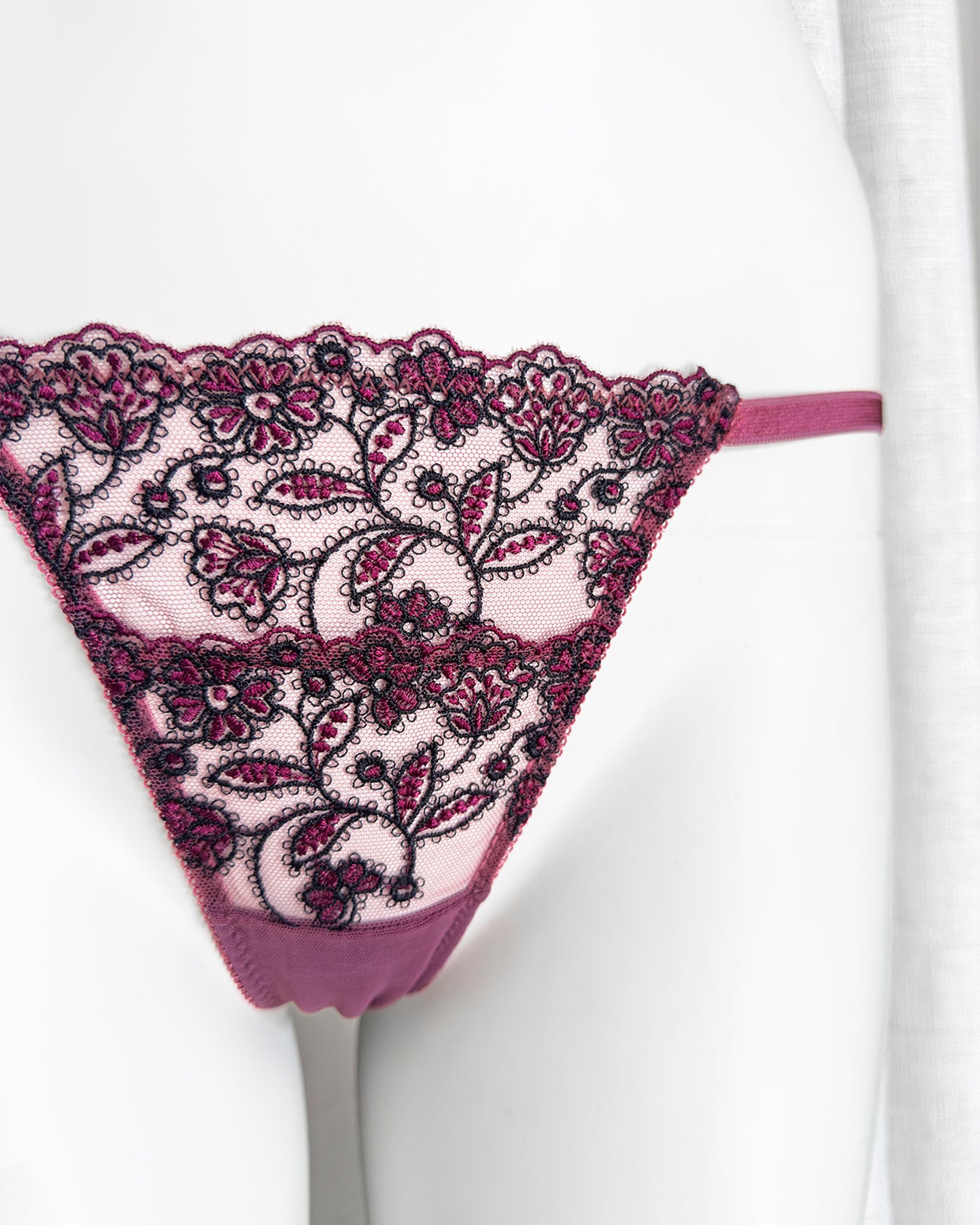 Perizoma realizzato in tulle malva con deliziosi fiorellini tono su tono e neri ricamati. Particolare elastico a cerchietti che riprende il motivo del ricamo. Retro in tulle malva.