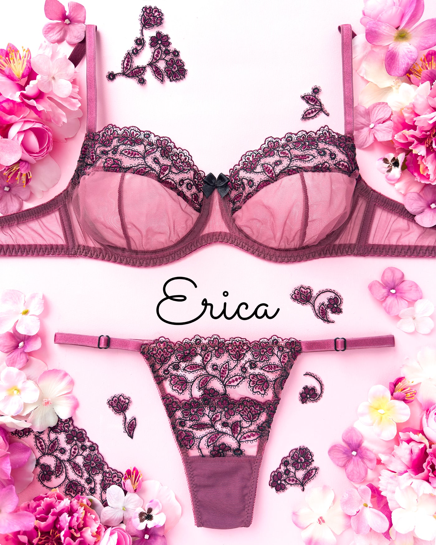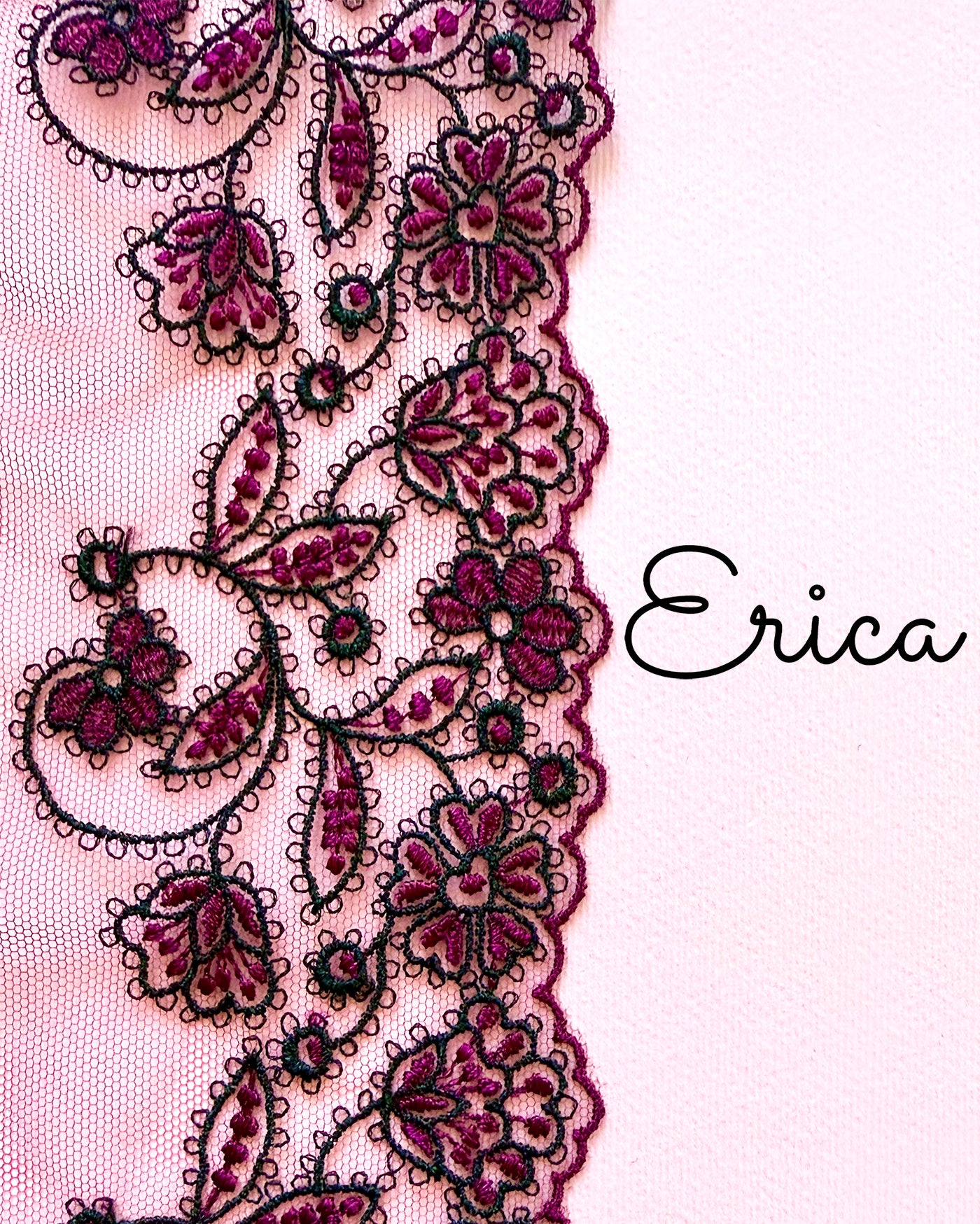 Malva e nero si intrecciano in un ricamo floreale iconico. Il vostro primo amore, ERICA, è tornato! Nuovi modelli, ma con la stessa classe di sempre.