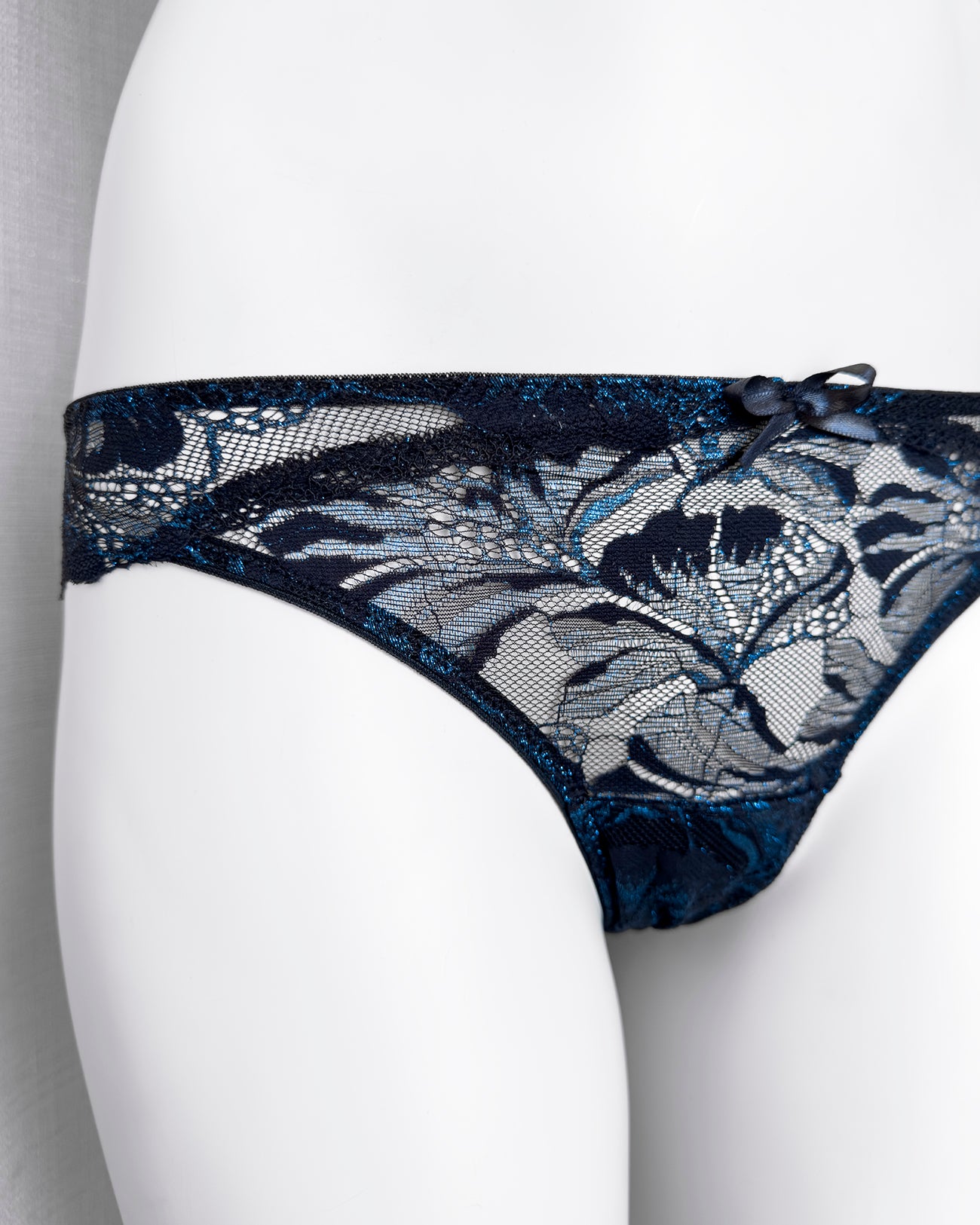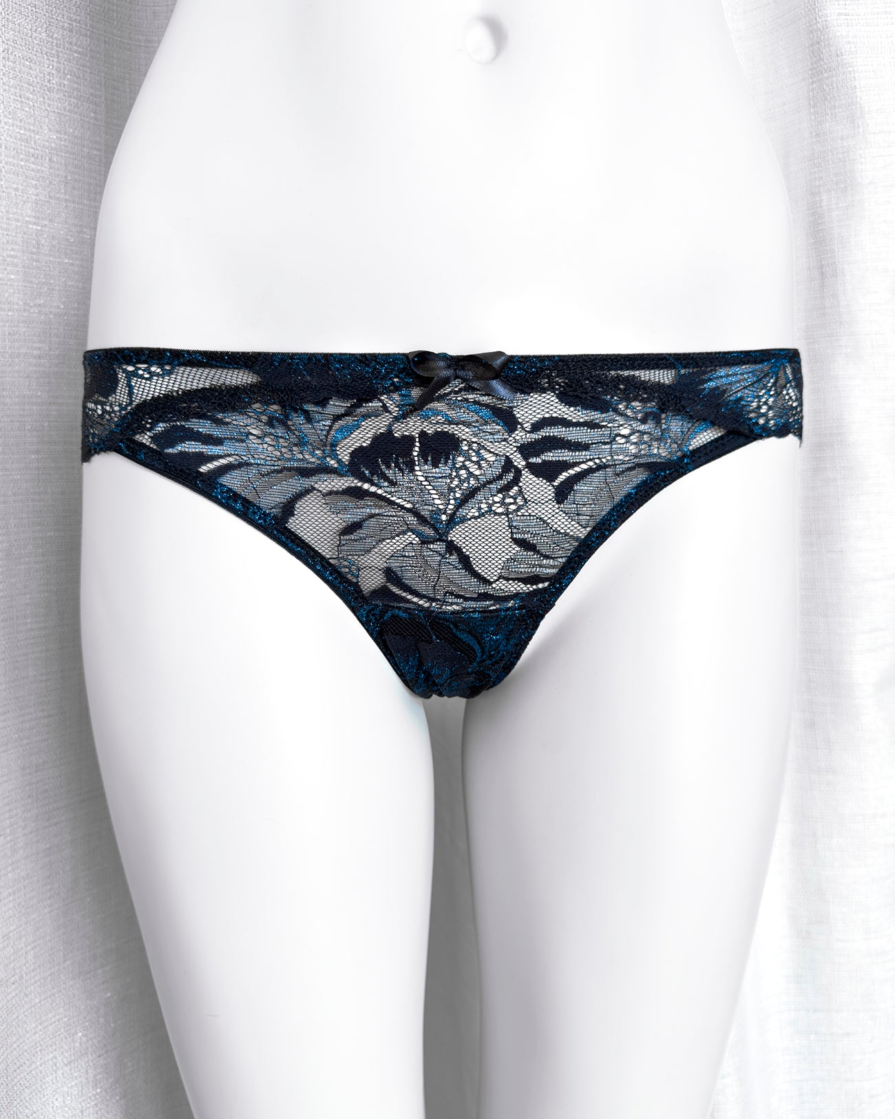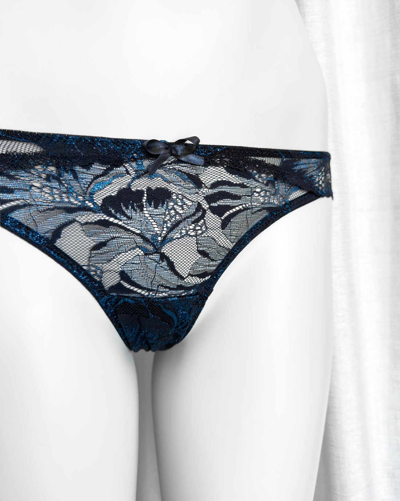 Slip a vita regolare totalmente realizzato in prezioso pizzo nero con una cascata di riflessi blu cobalto in filato lurex. Fiocco centrale in raso nero. Pattina interna in 100% cotone biologico. La parte frontale mantiene perfettamente l'aderenza grazie al comodissimo elastico in silicone (ecco spiegata la magica illusione di trasparenza) ed il retro non segna grazie alla particolare lavorazione!
