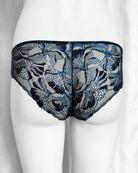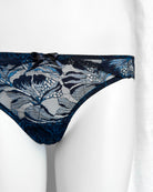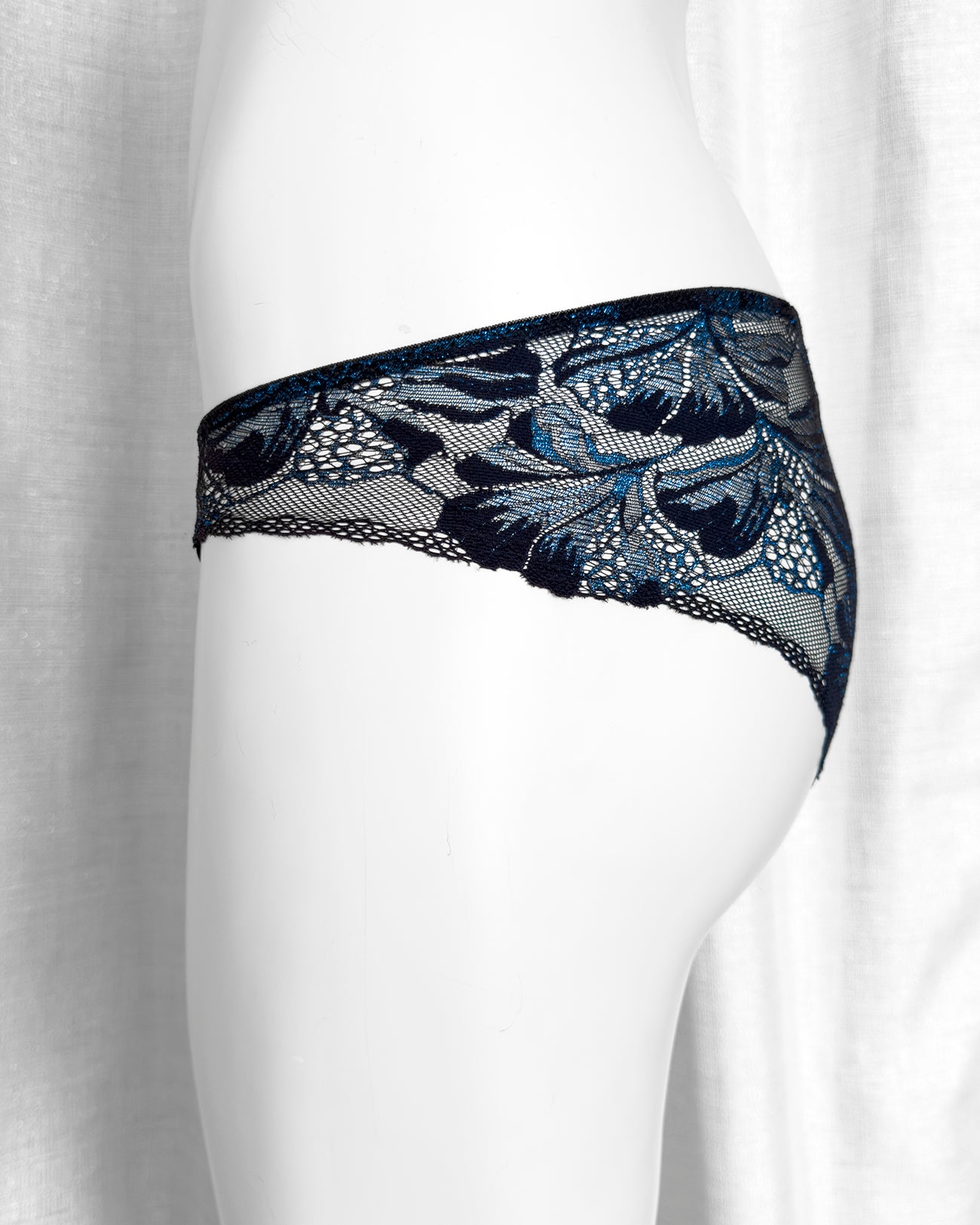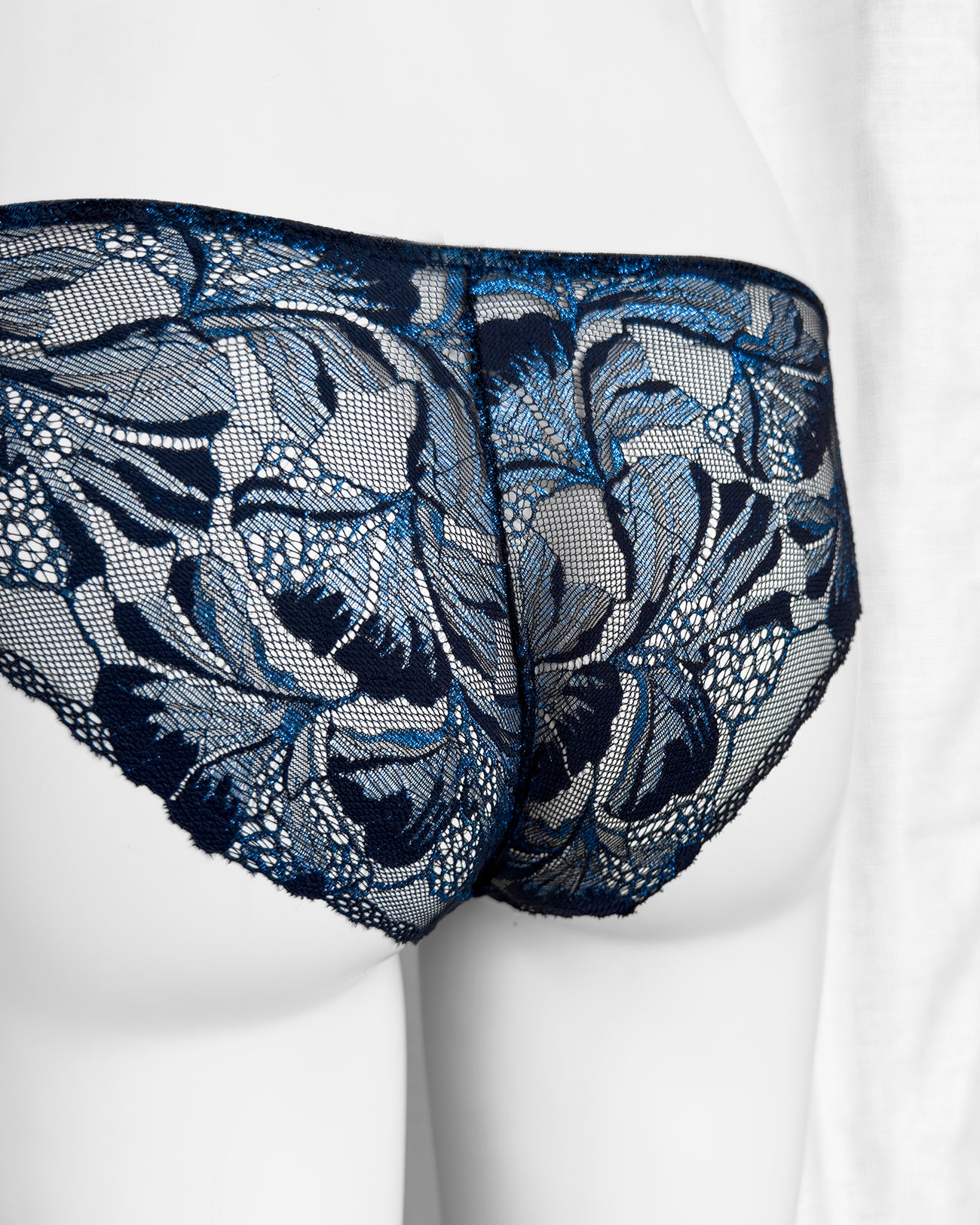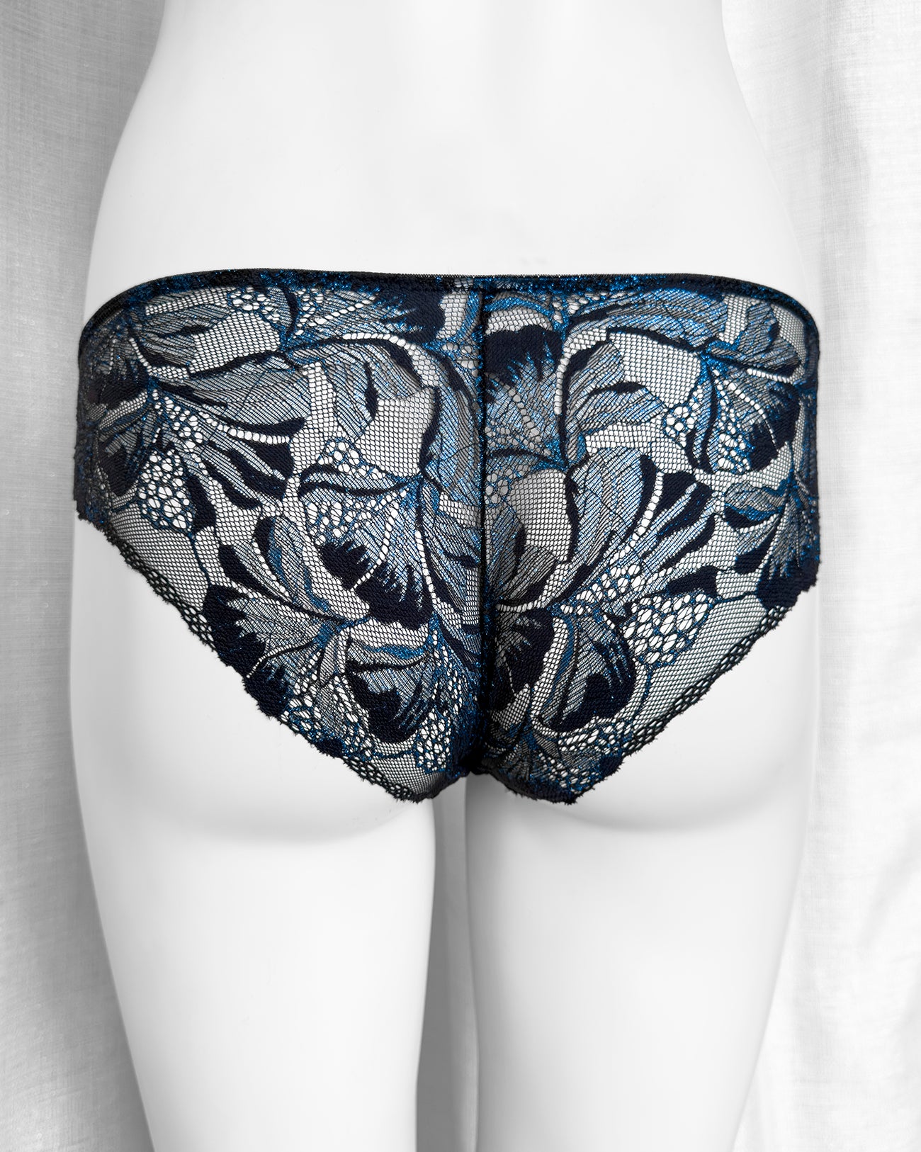 Slip a vita regolare totalmente realizzato in prezioso pizzo nero con una cascata di riflessi blu cobalto in filato lurex. Fiocco centrale in raso nero. Pattina interna in 100% cotone biologico. La parte frontale mantiene perfettamente l'aderenza grazie al comodissimo elastico in silicone (ecco spiegata la magica illusione di trasparenza) ed il retro non segna grazie alla particolare lavorazione!