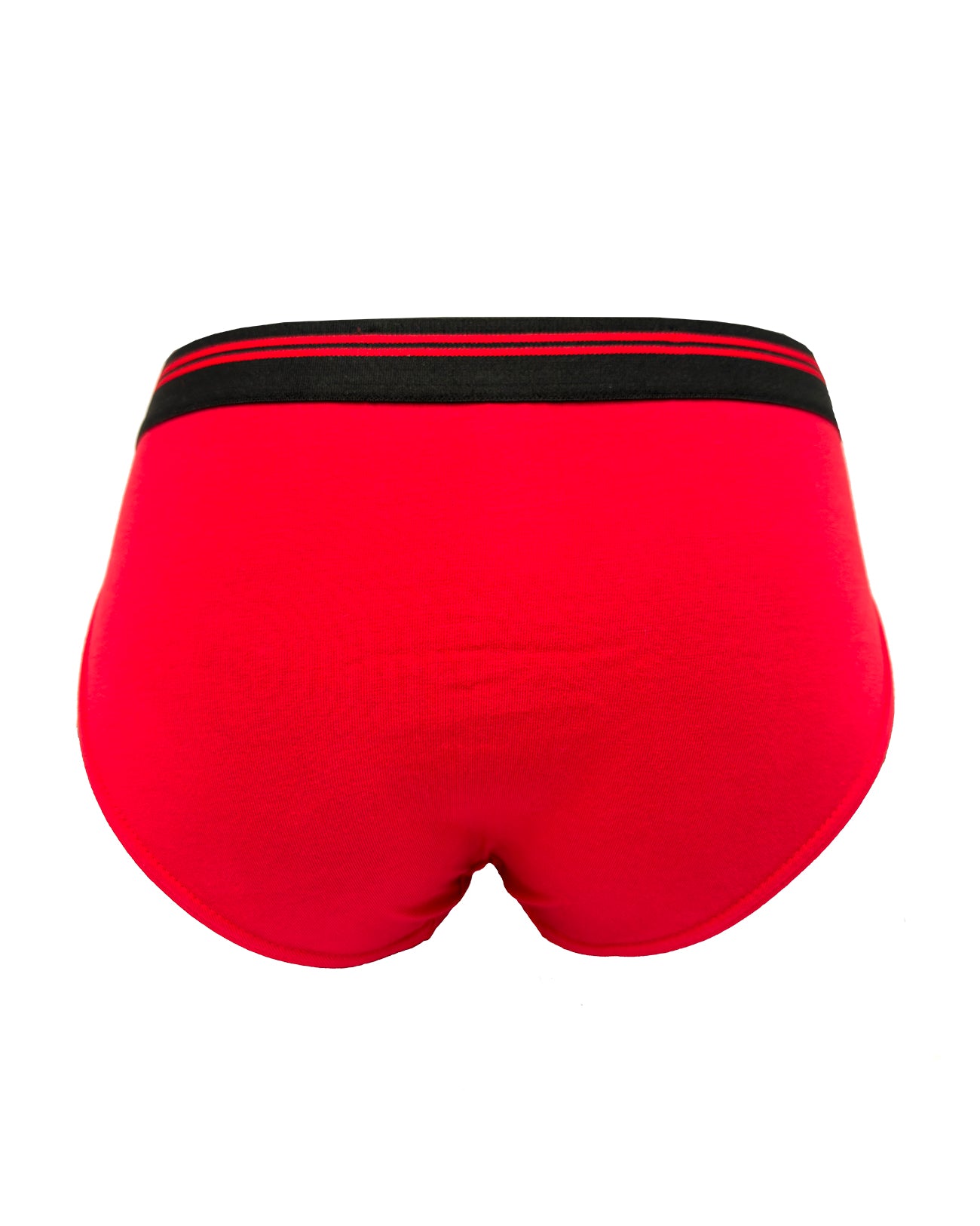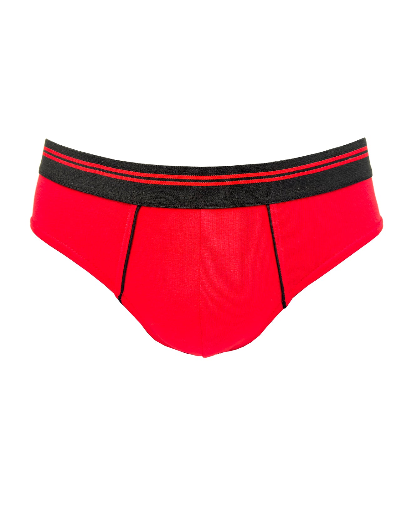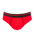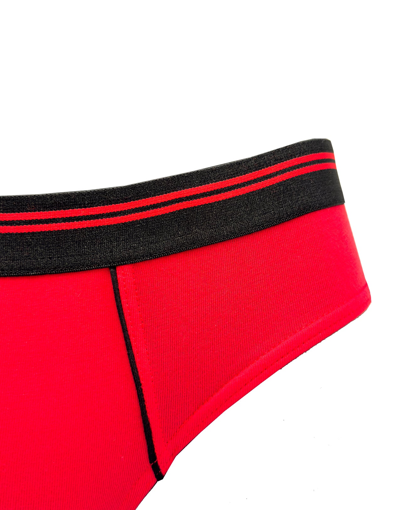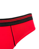 Slip da uomo in cotone biologico rosso fiamma. Bacchettatura in cotone nero sulla conchiglia. Morbidissimo elastico esterno opaco nero con motivo a doppio rigo rosso. I dettagli fanno la differenza!
