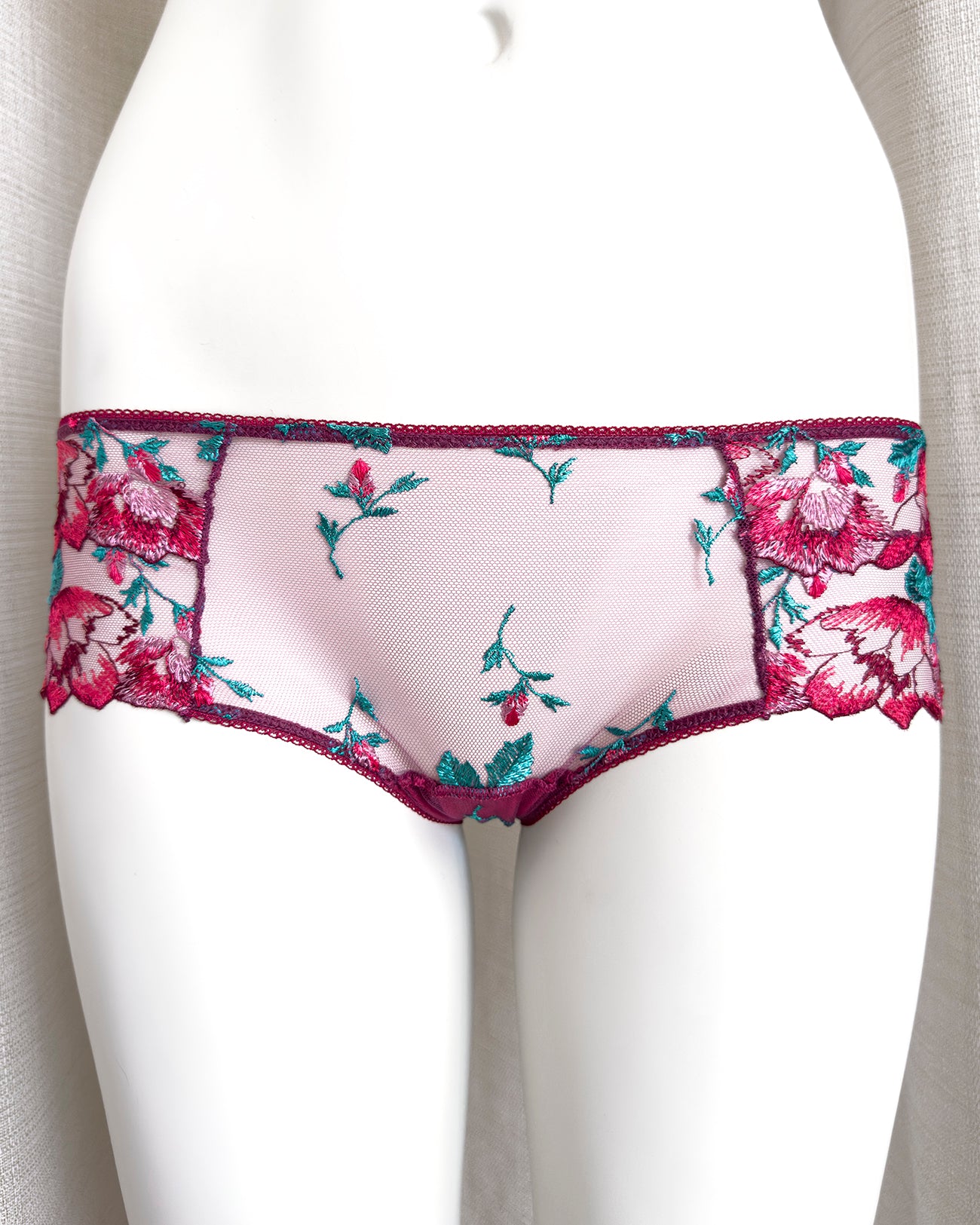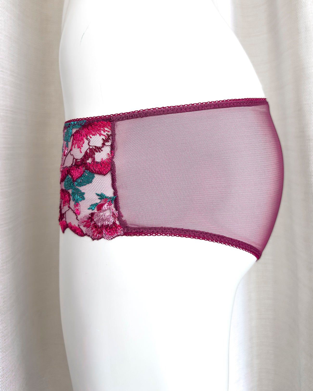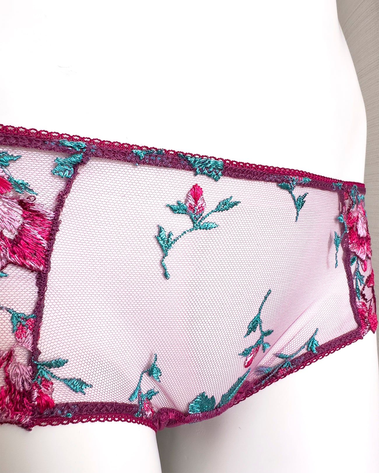Culotte a vita bassa. Parte frontale realizzata in elegantissimo tulle ricamato con foglie e fiori dalle mille sfumature di bordeaux e rosa. Il resto del capo è realizzato interamente in tulle elasticizzato in coordinato: sensuale trasparenza e comodità assicurate! Elastico a cerchietti (perchè tutti i dettagli sono importanti!).