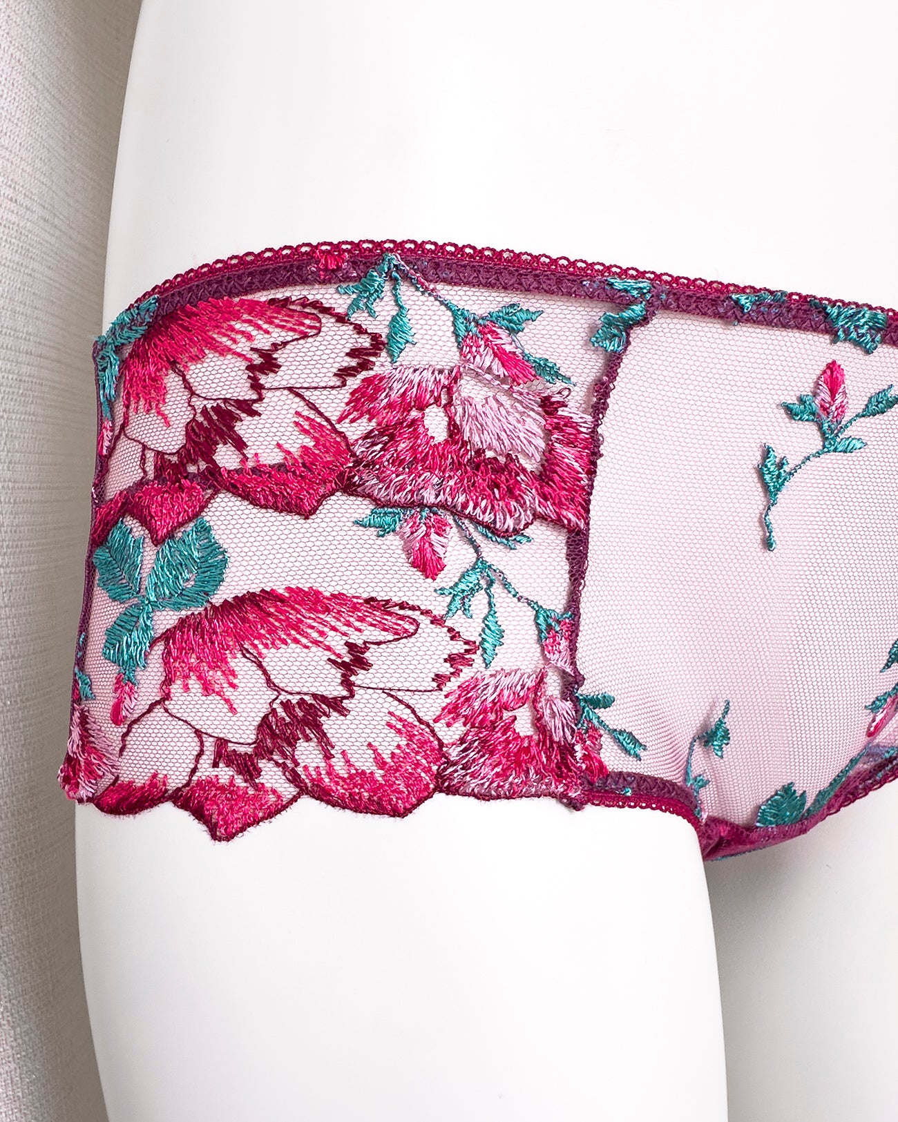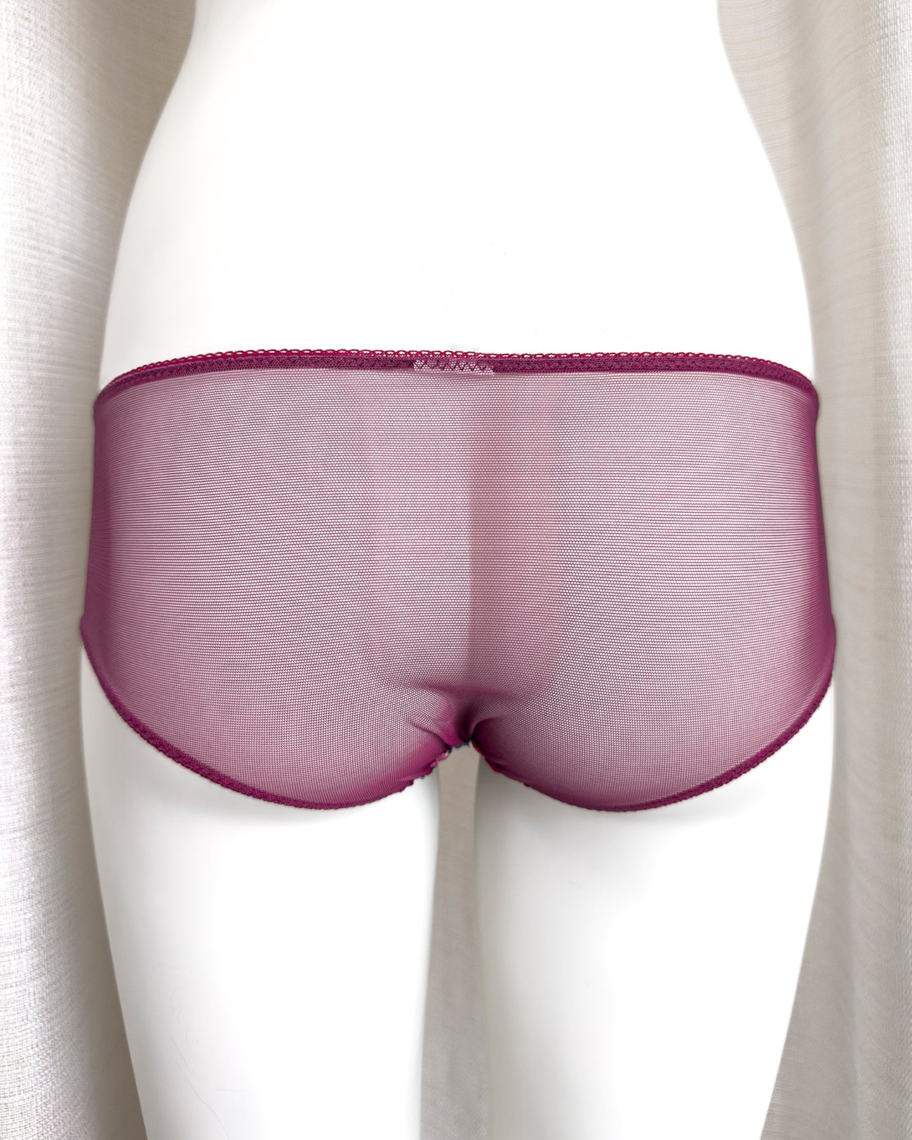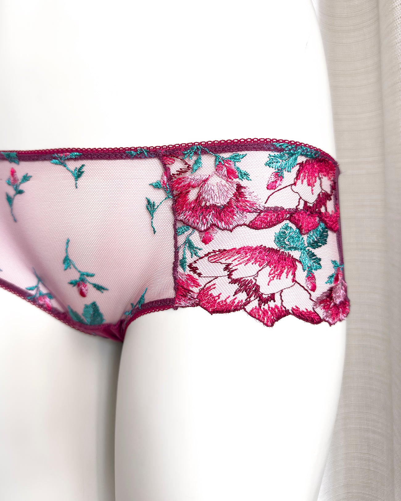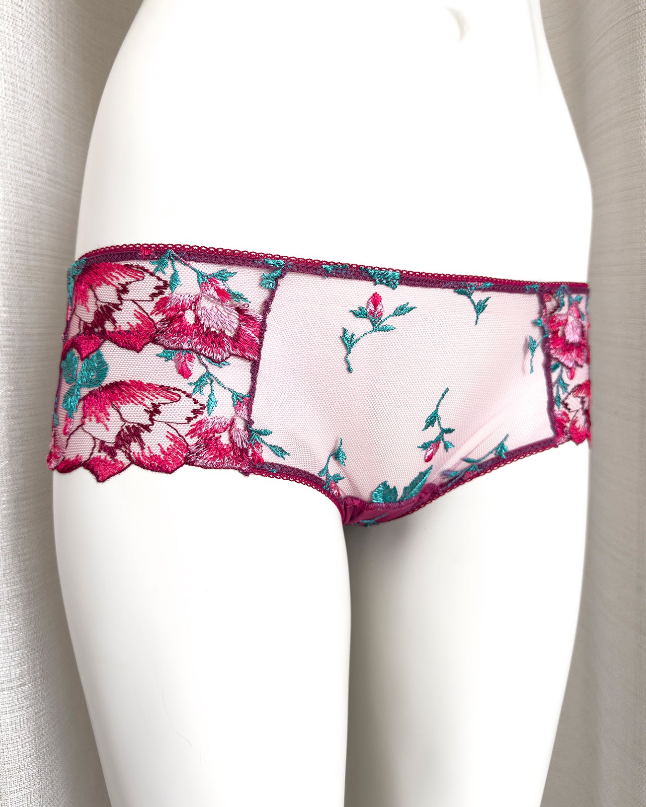 Culotte a vita bassa. Parte frontale realizzata in elegantissimo tulle ricamato con foglie e fiori dalle mille sfumature di bordeaux e rosa. Il resto del capo è realizzato interamente in tulle elasticizzato in coordinato: sensuale trasparenza e comodità assicurate! Elastico a cerchietti (perchè tutti i dettagli sono importanti!).