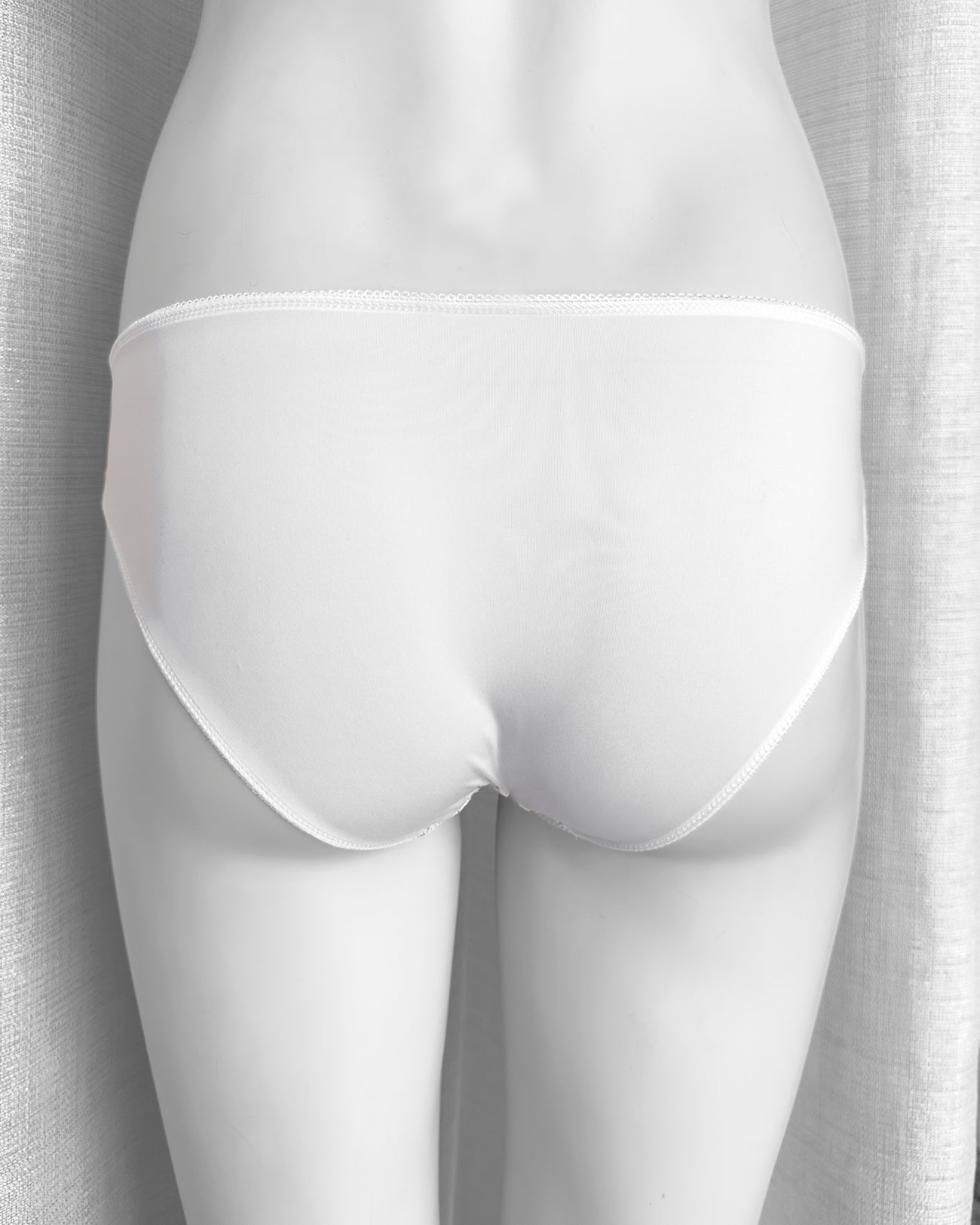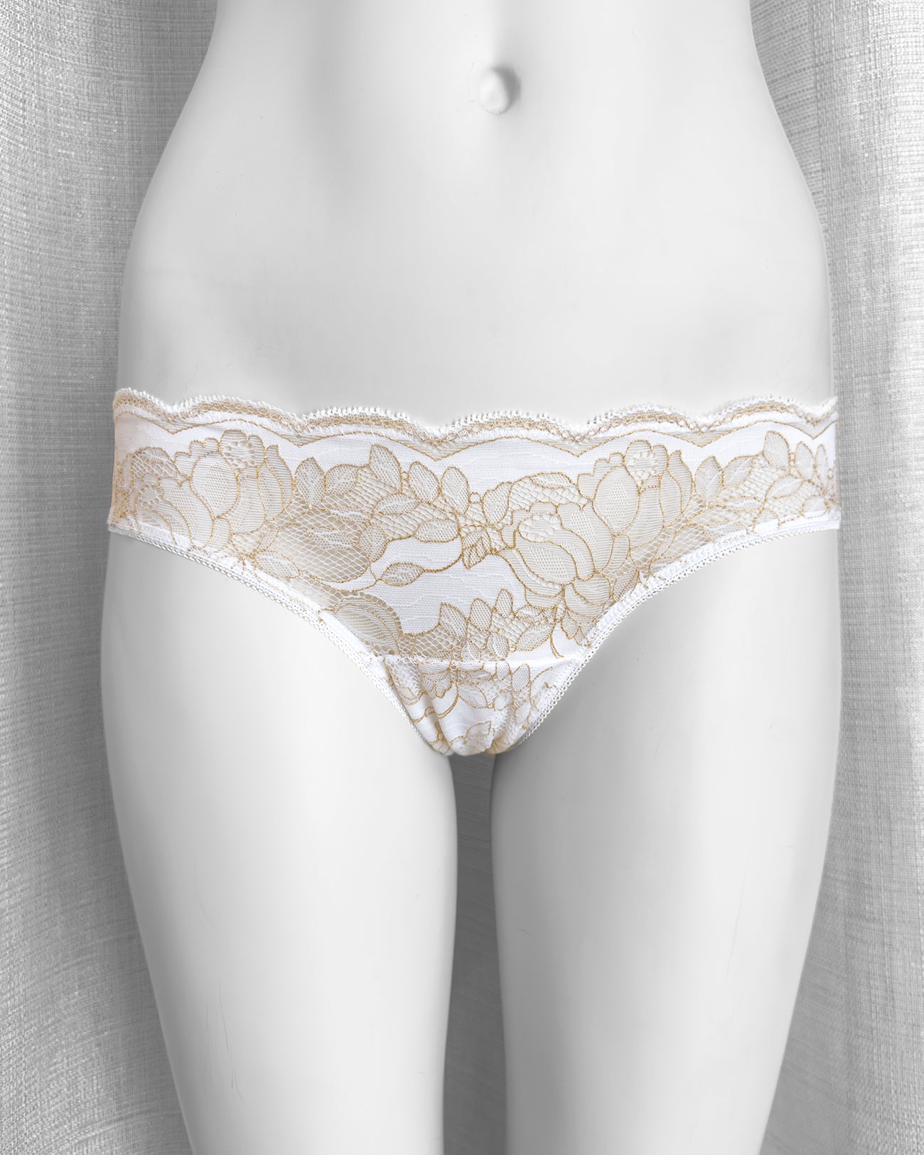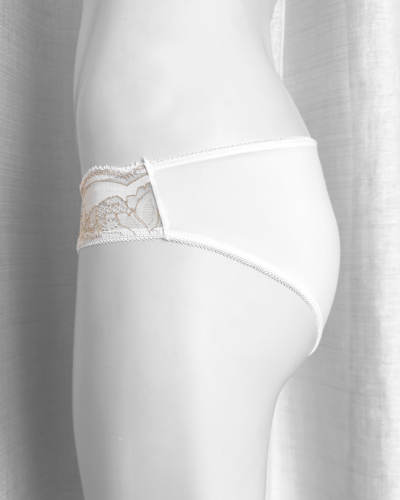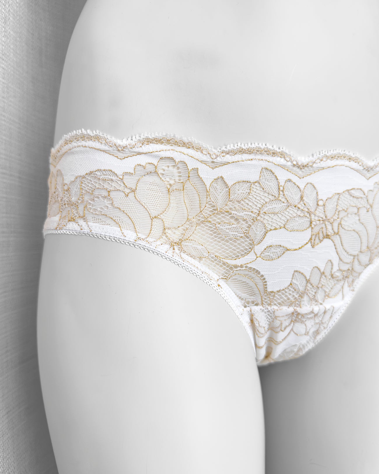 Slip a vita regolare realizzato in pizzo bianco latte con disegno floreale ed inserti in lurex oro. Delizioso smerlo con piccoli cerchi dorati. Retro in morbidissima microfibra bianco latte. Elastico con motivo che riprende il pizzo e dettagli lucidi. Pattina interna in 100% cotone.