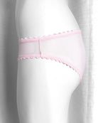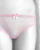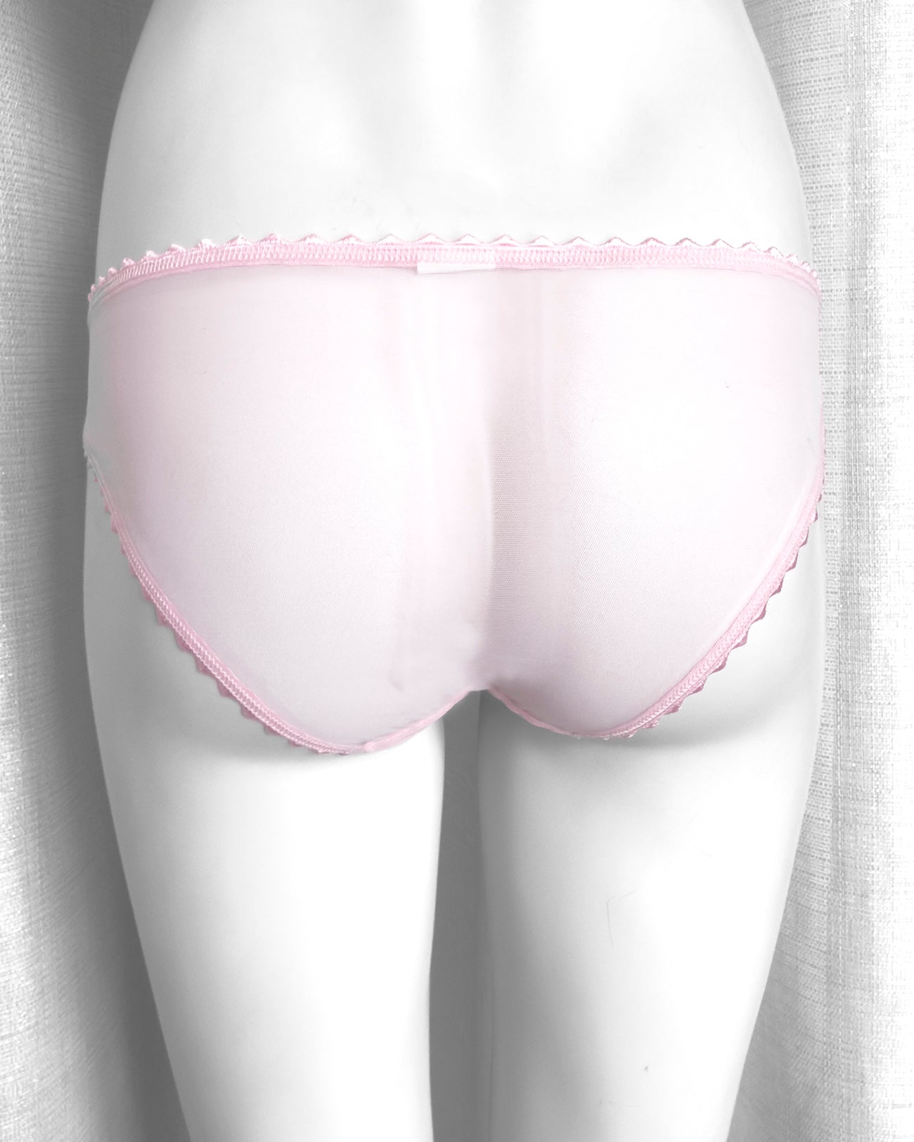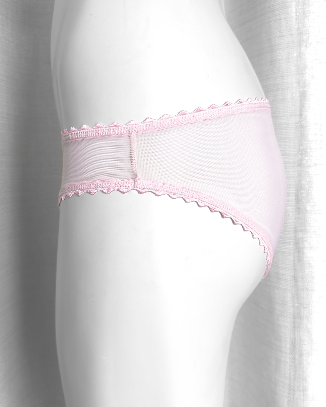 Slip a vita regolare realizzato interamente in morbidissimo tulle colorato rosa chiaro con elastico a onde lucide e fiocchetto in coordinato. Pattina interna in 100% cotone.
