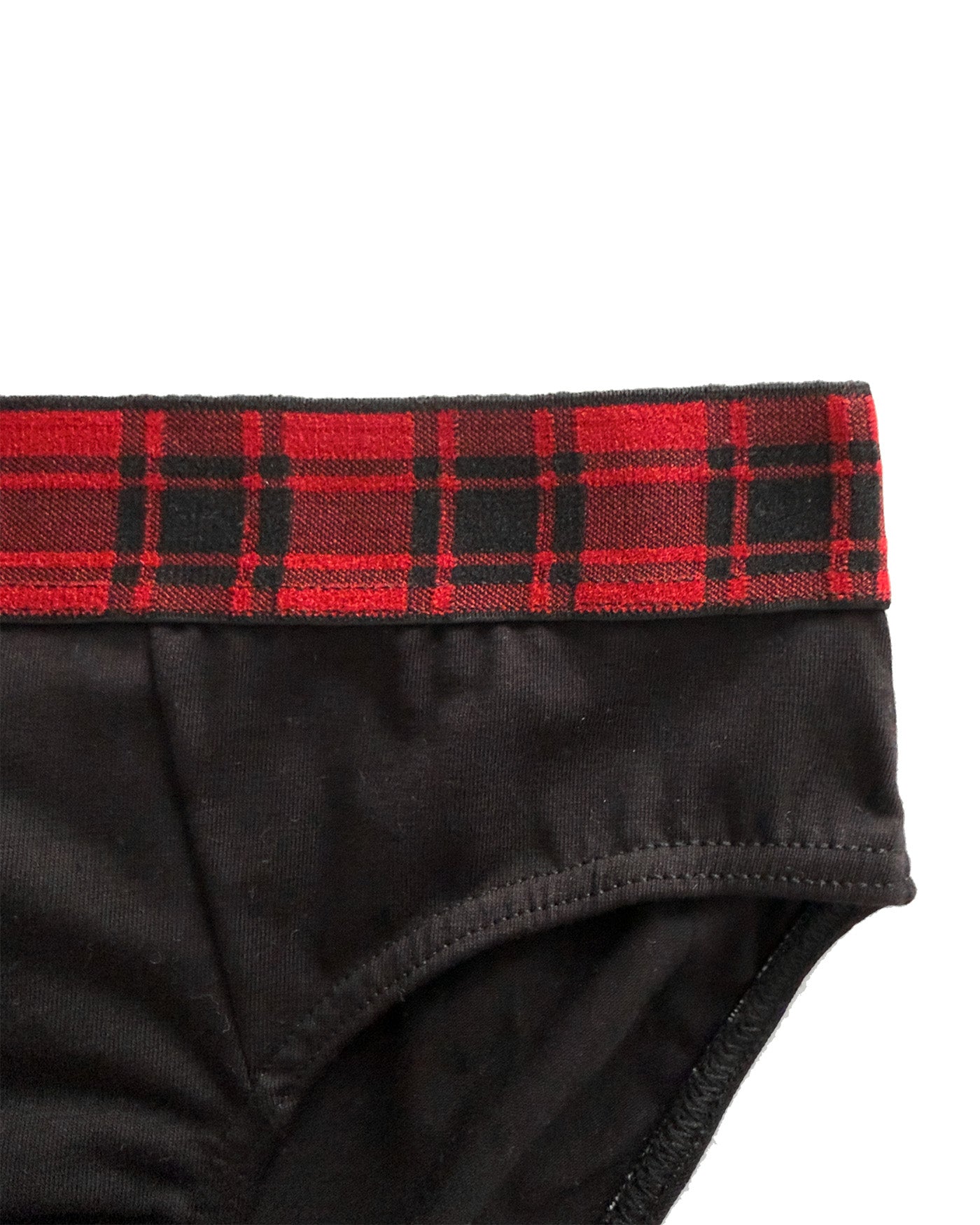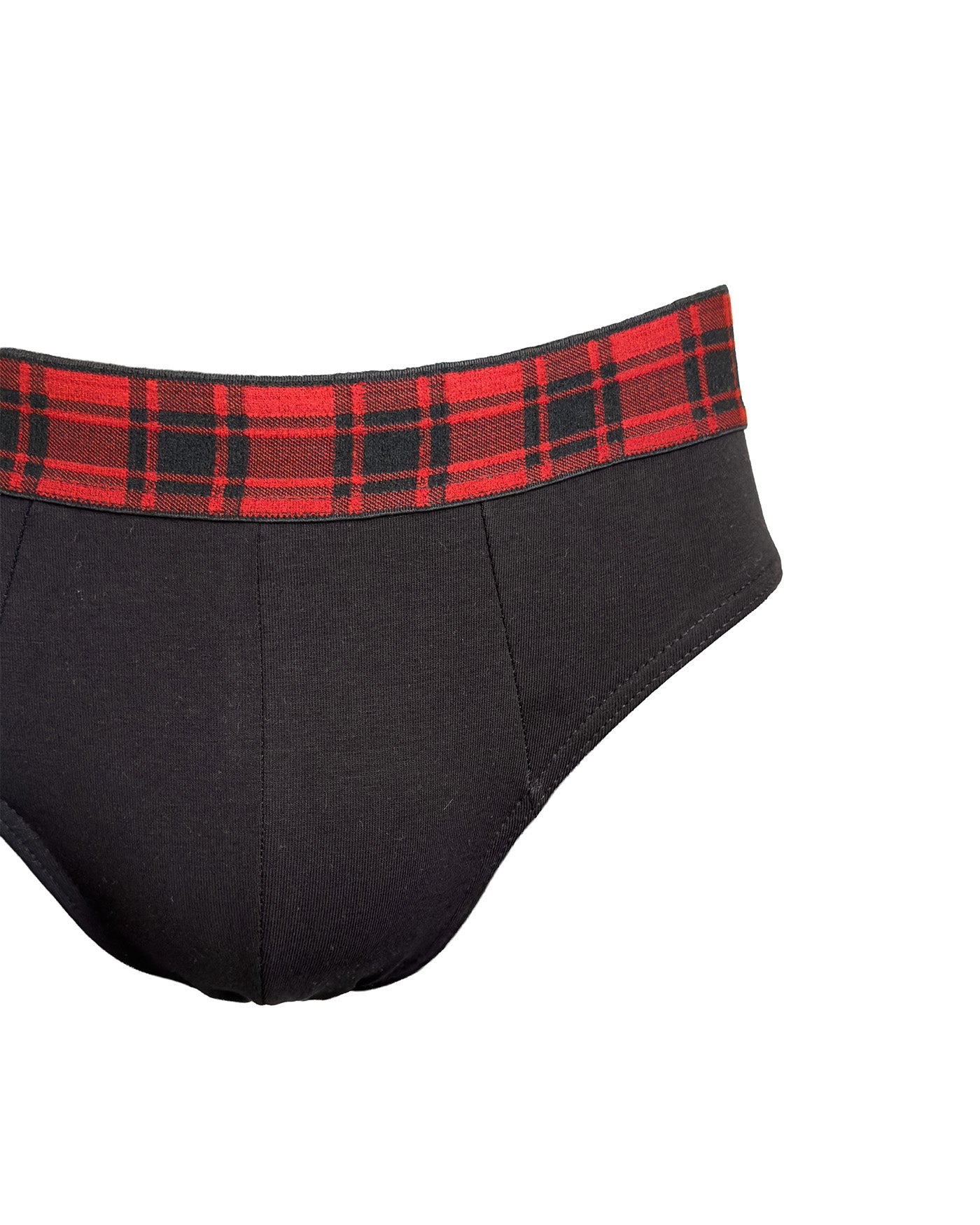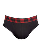 Slip da uomo in cotone biologico nero. Morbidissimo elastico esterno nero con disegno scozzese nero e rosso.