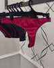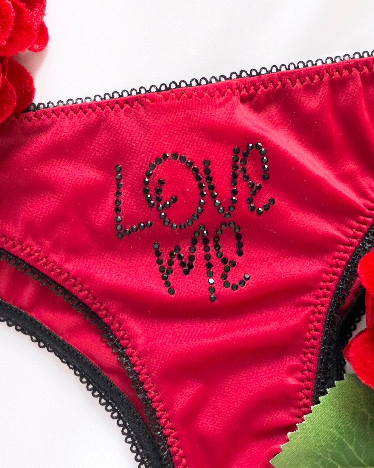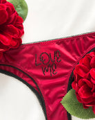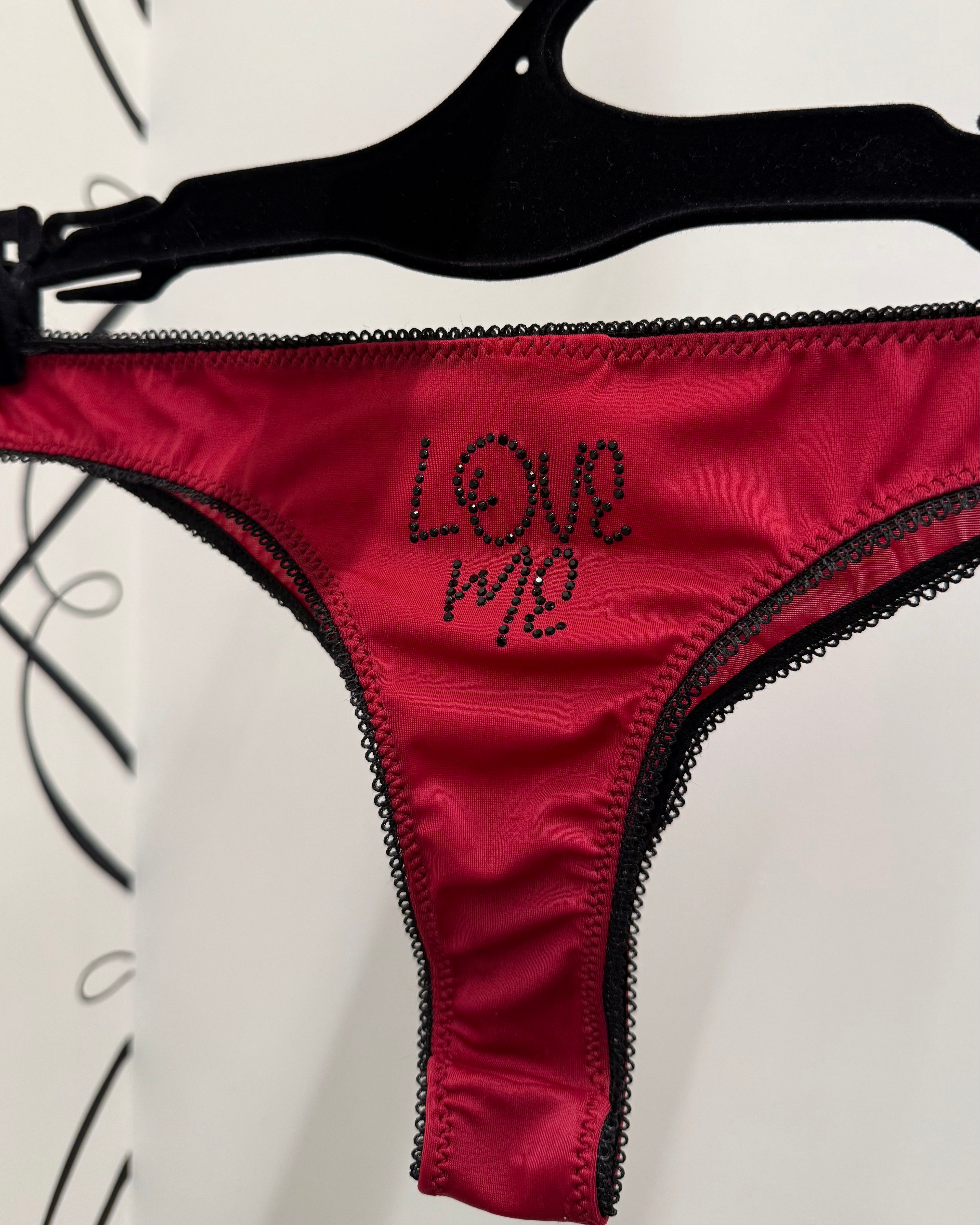 Brasiliana a vita regolare in morbidissimo tessuto elasticizzato bordeaux. Incantevole applicazione SUL RETRO in cristalli neri (di prima qualità per luminosità e resistenza) con scritta "LOVE ME". Pattina in 100% cotone.