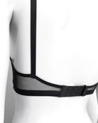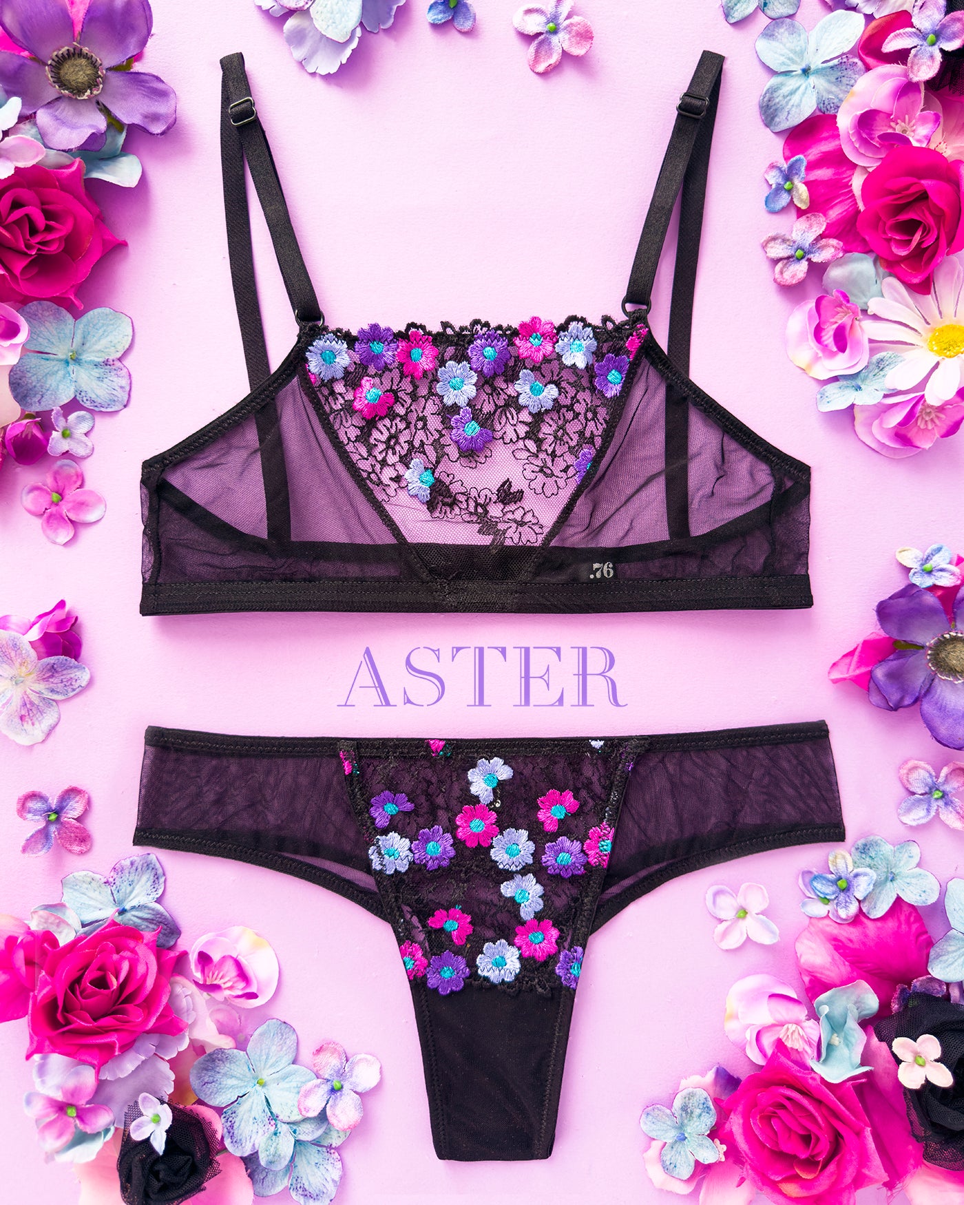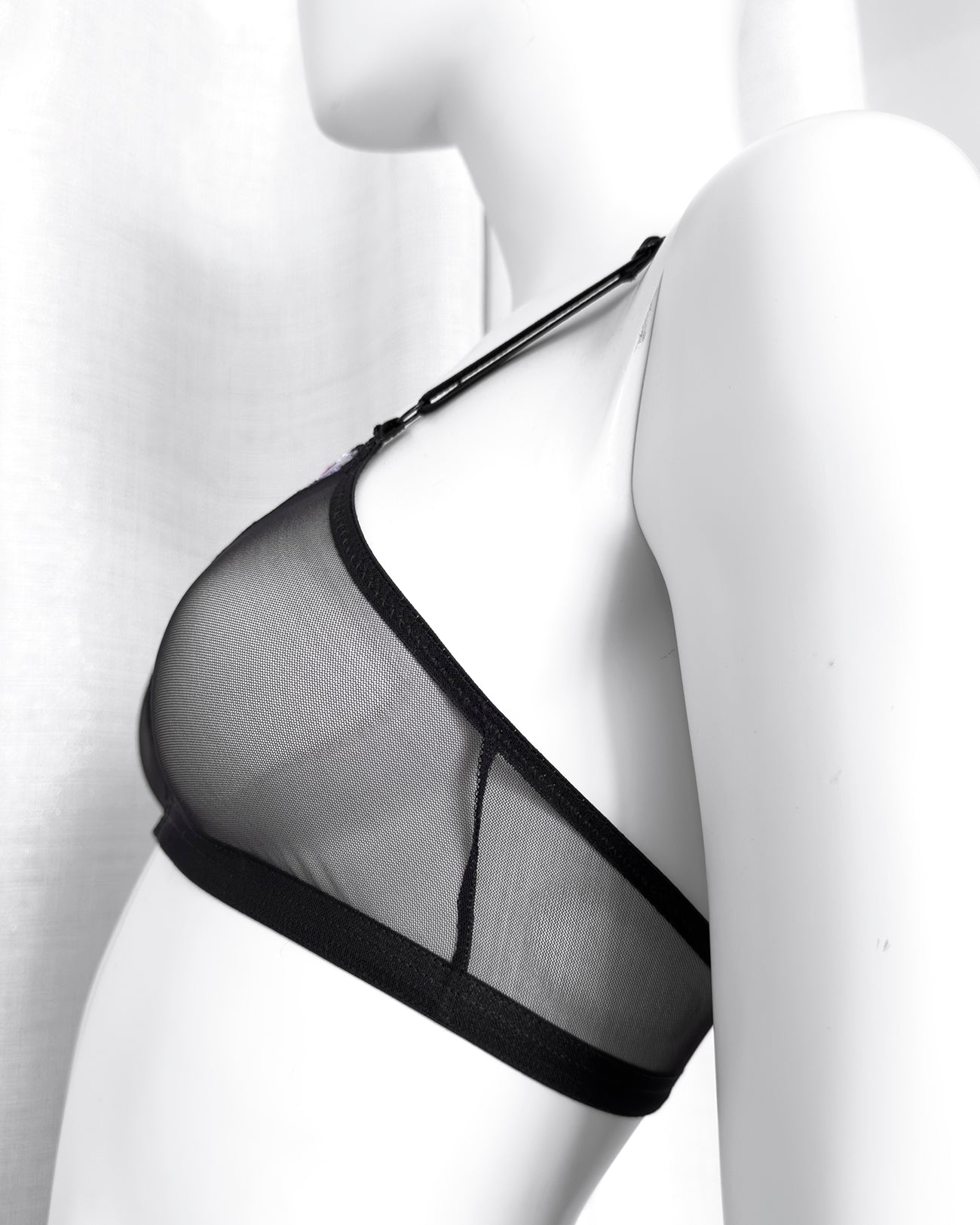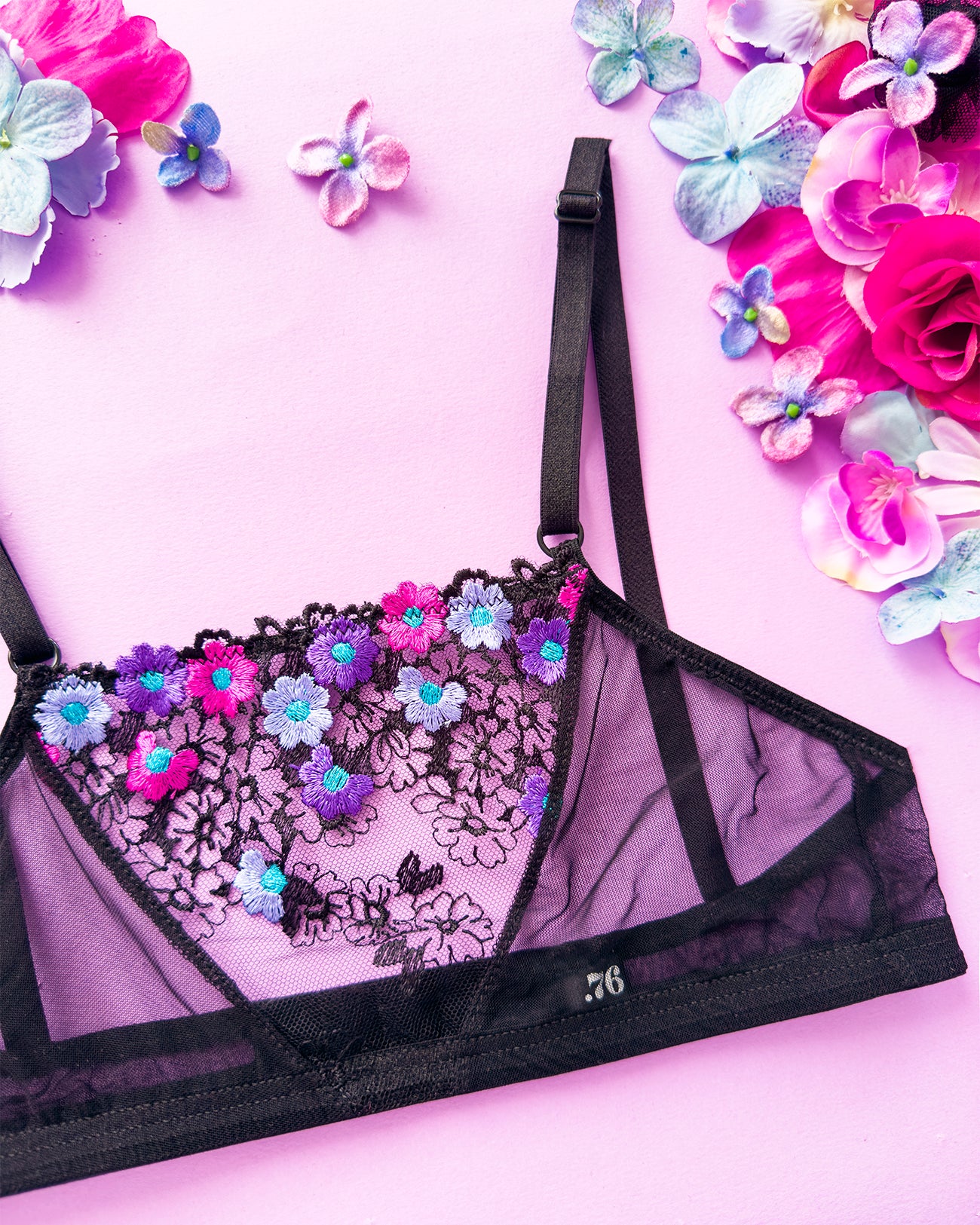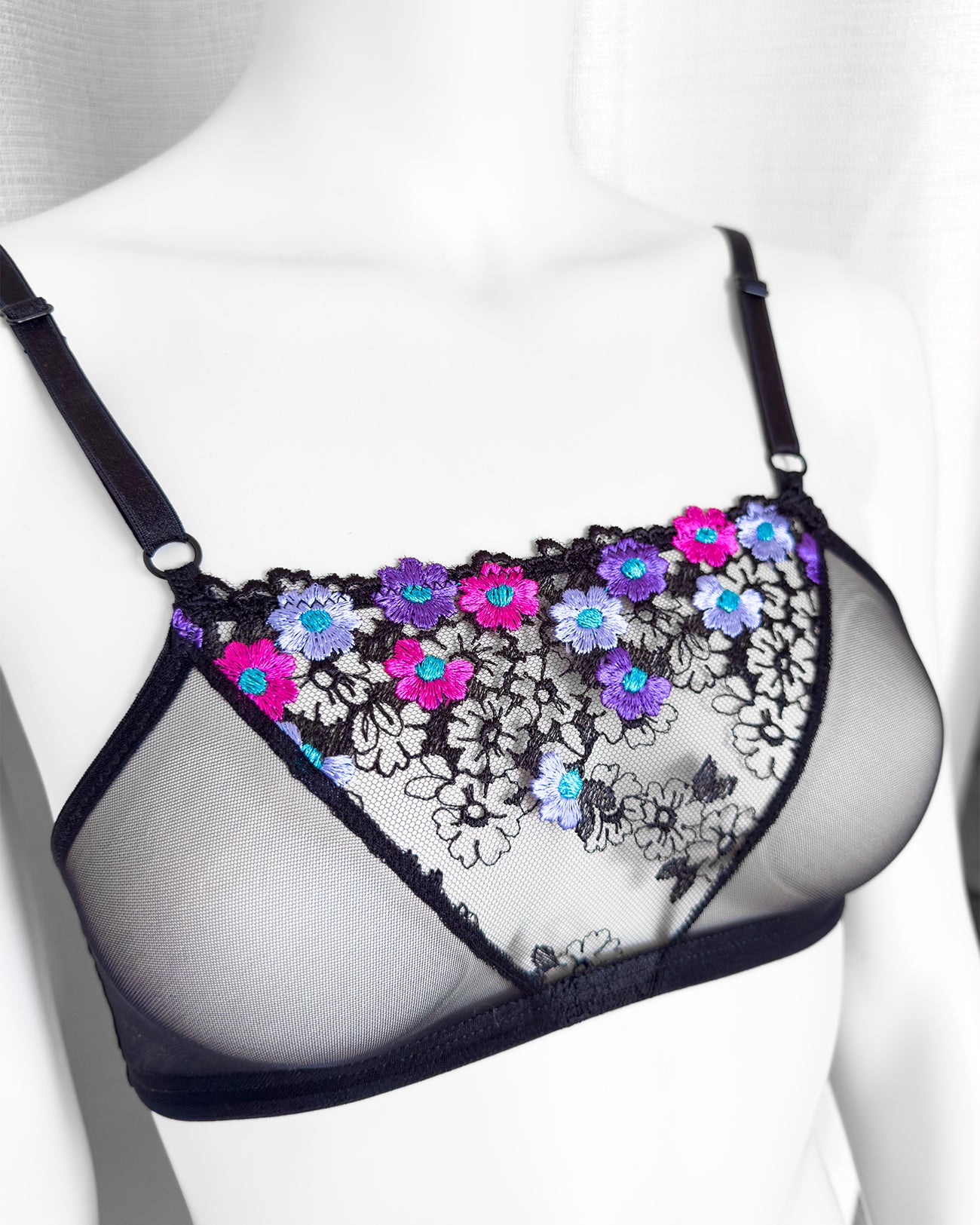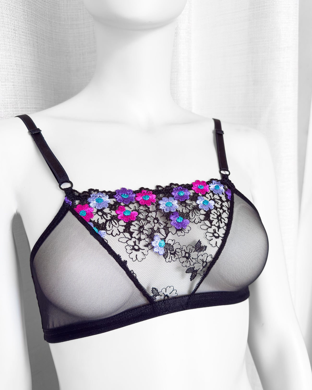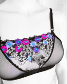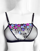 Realizzata in soffice e malizioso tulle, inserto centrale in tulle nero ricamato con fiorellini fucsia, indaco e viola con centro in filato lurex a contrasto. Anellini e regolatori in metallo nichel free neri: mai dimenticare l’importanza degli accessori!
