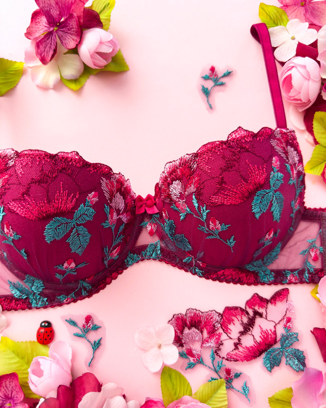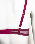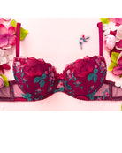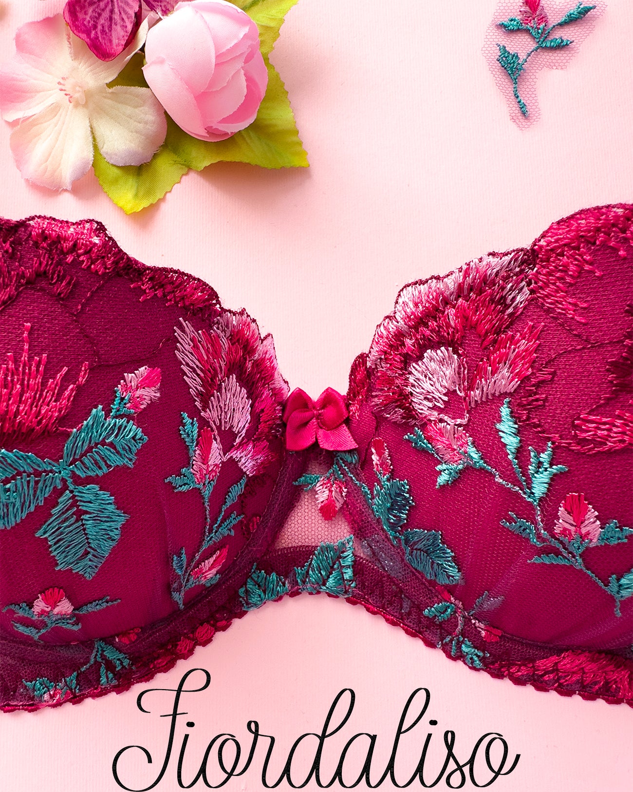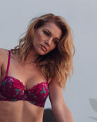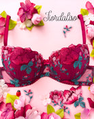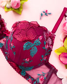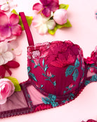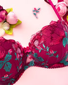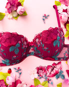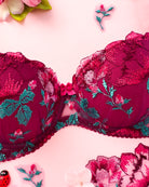 Reggiseno push-up con ferretto e stecchette laterali, realizzato in elegantissimo tulle ricamato con foglie e fiori dalle mille sfumature di bordeaux e rosa. Deliziosa lavorazione plissè della coppa (realizzata a mano) per godere di tutta la bellezza del ricamo senza alcuna interruzione! Il ricamo è drappeggiato sulla coppa accarezzandola: ogni capo è meraviglioso nella sua unicità! Fusti laterali in tulle elasticizzato in nuance di colore.