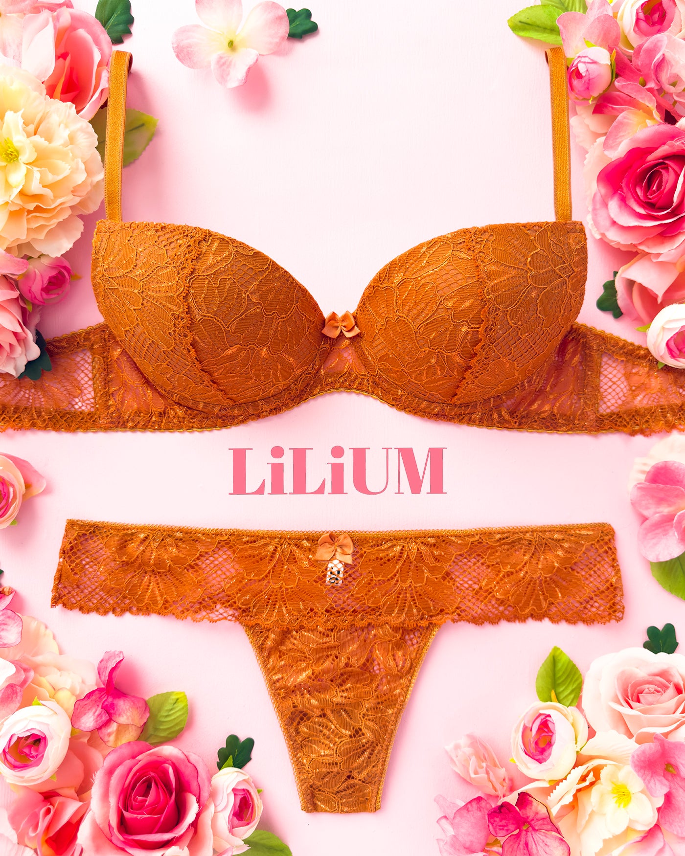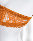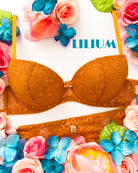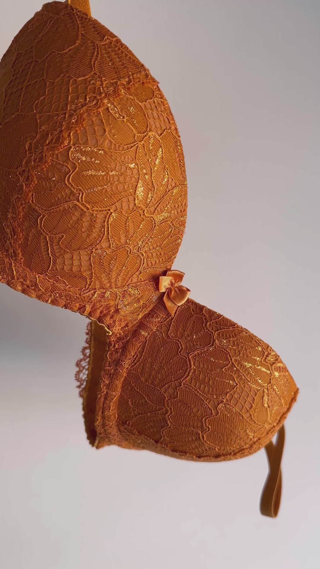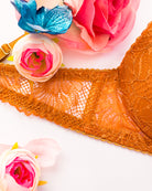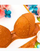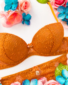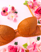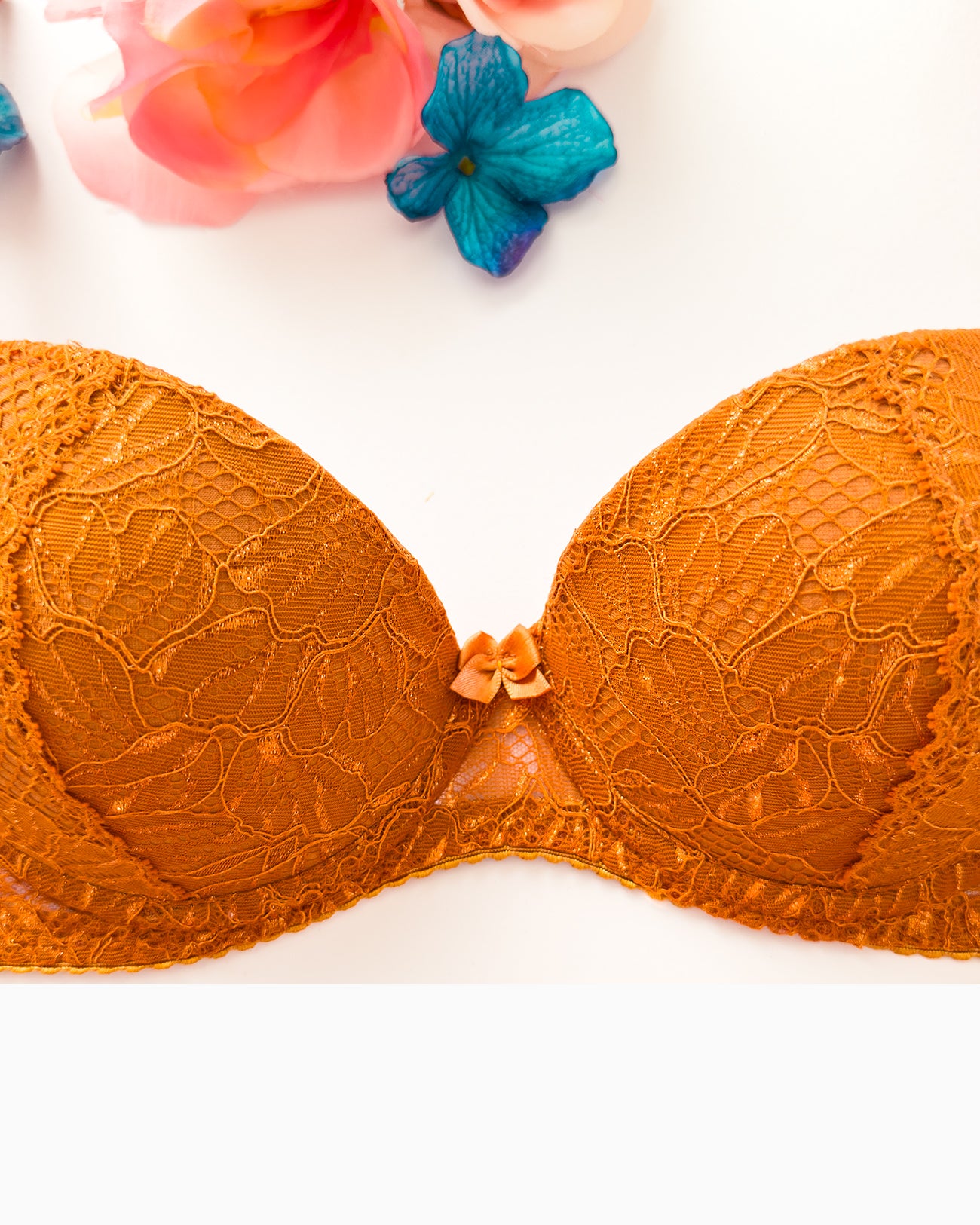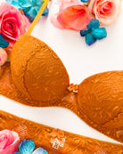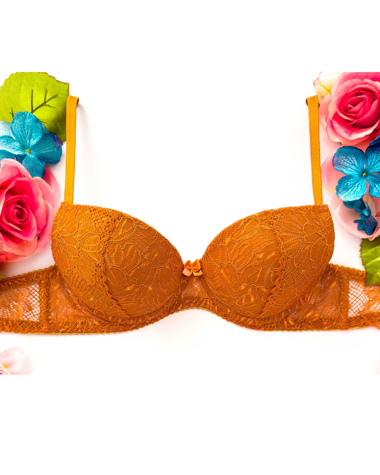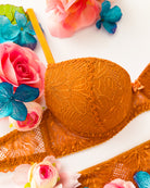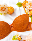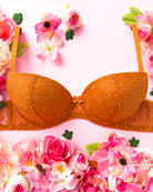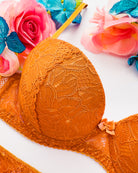 Reggiseno push-up realizzato interamente in pizzo arancio ruggine con fiori cordonati (disegno pazzesco), inserti luminosi (tutto è più bello quando brilla) e con base microretata. Fiocco centrale in raso in abbinamento.