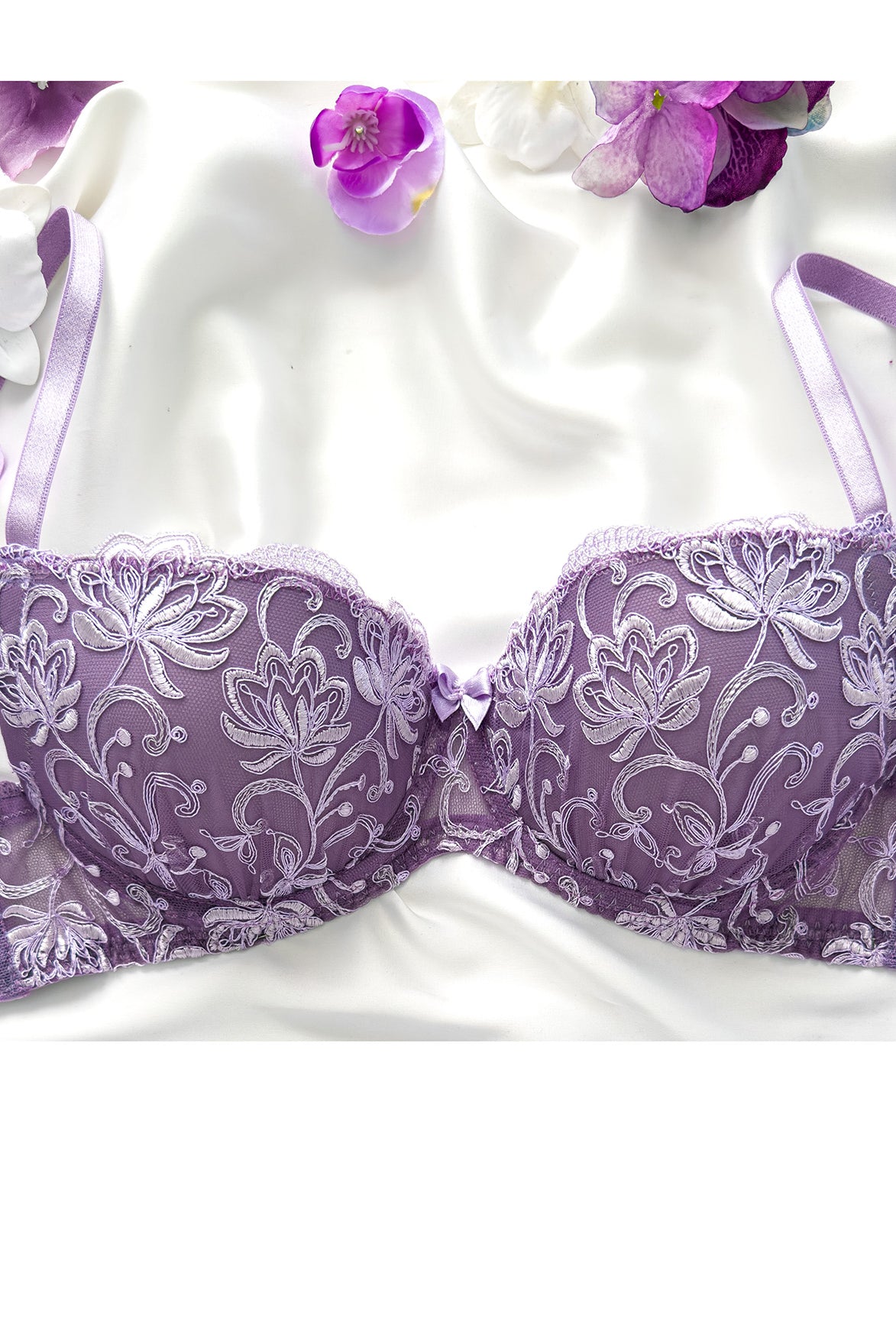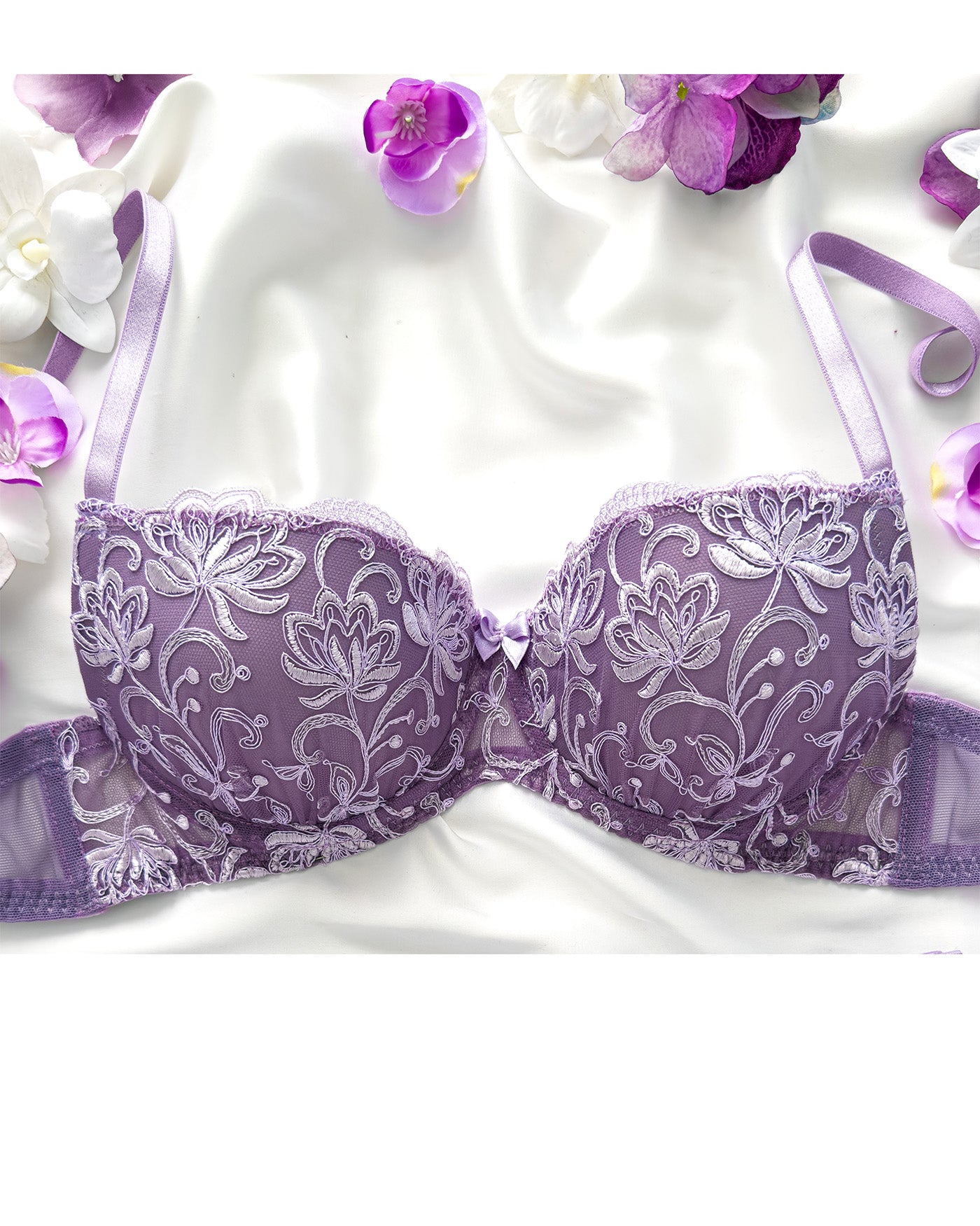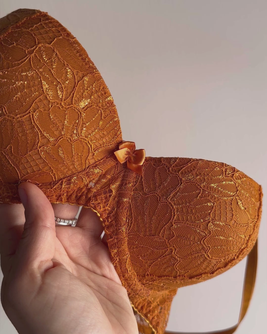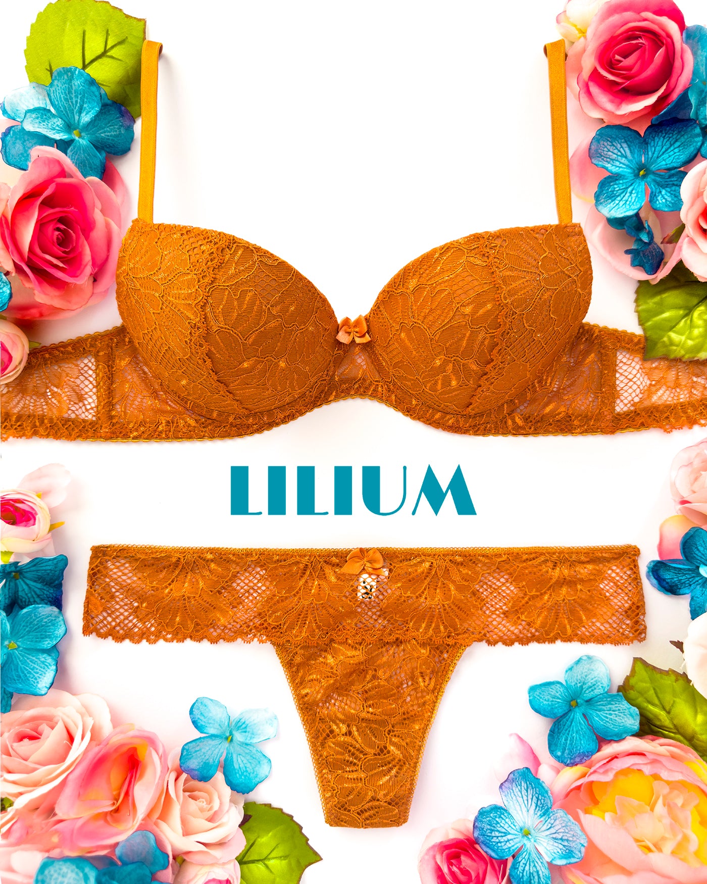 Reggiseno push-up realizzato interamente in pizzo arancio ruggine con fiori cordonati (disegno pazzesco), inserti luminosi (tutto è più bello quando brilla) e con base microretata. Fiocco centrale in raso in abbinamento.