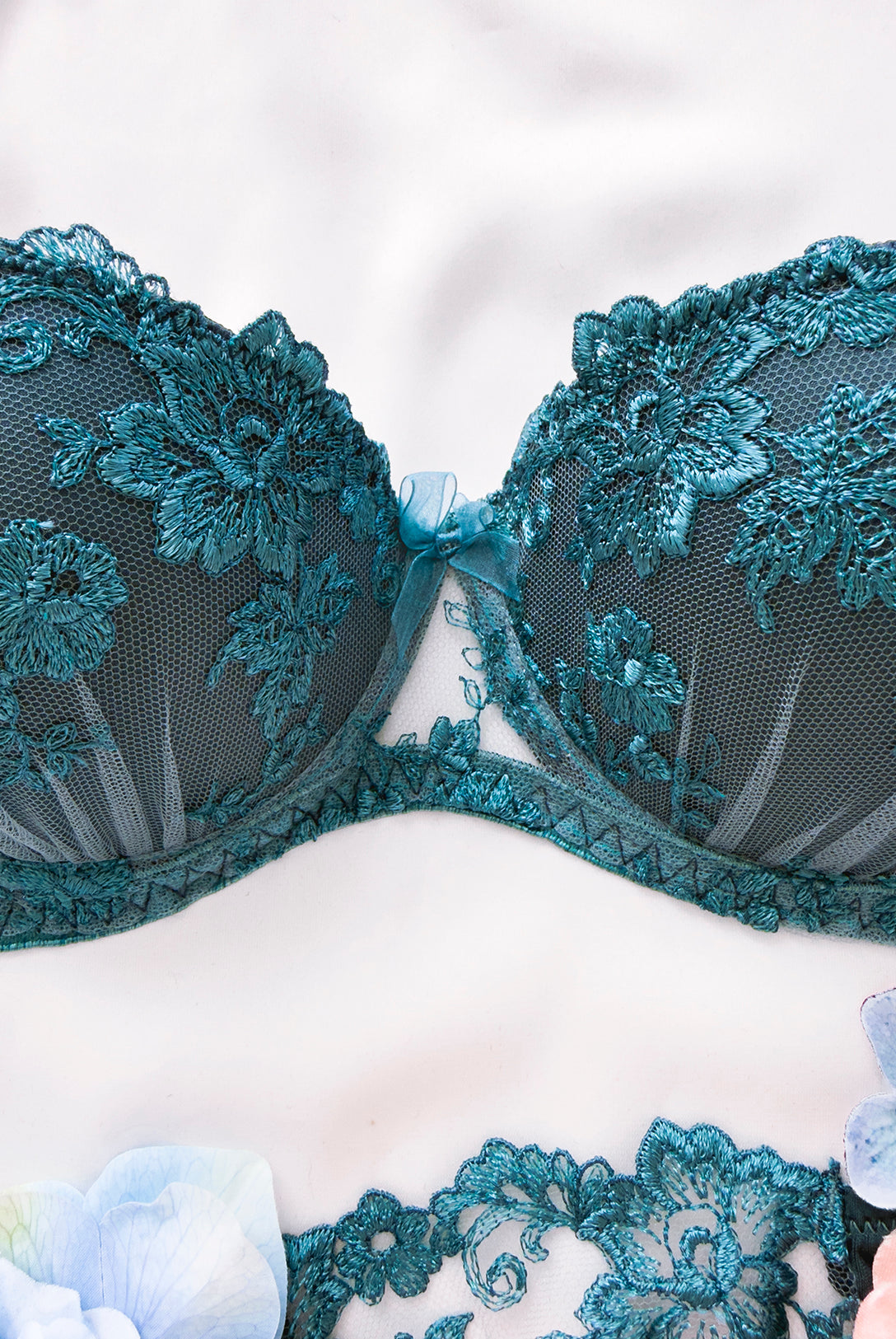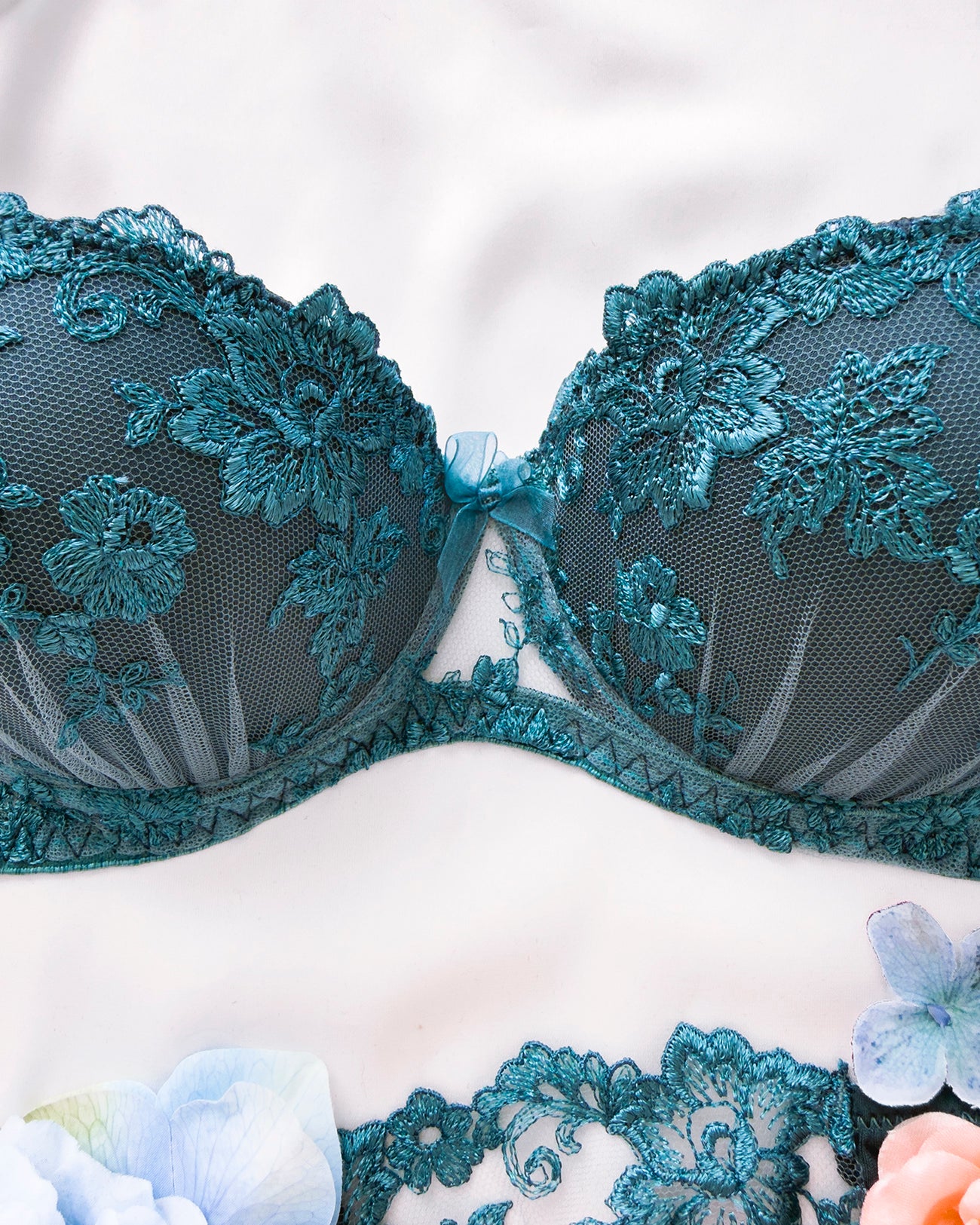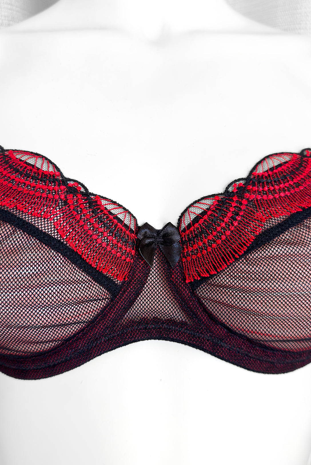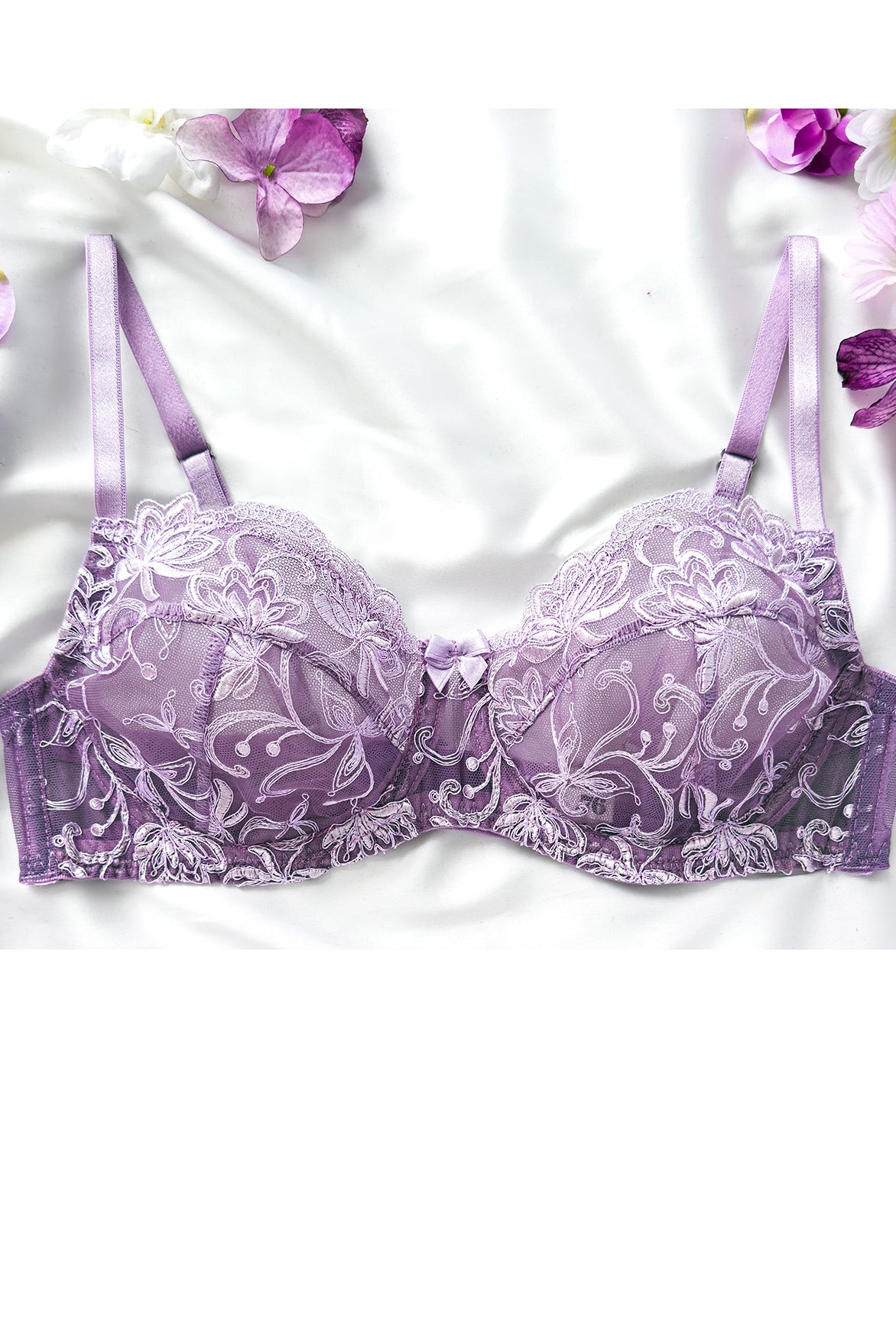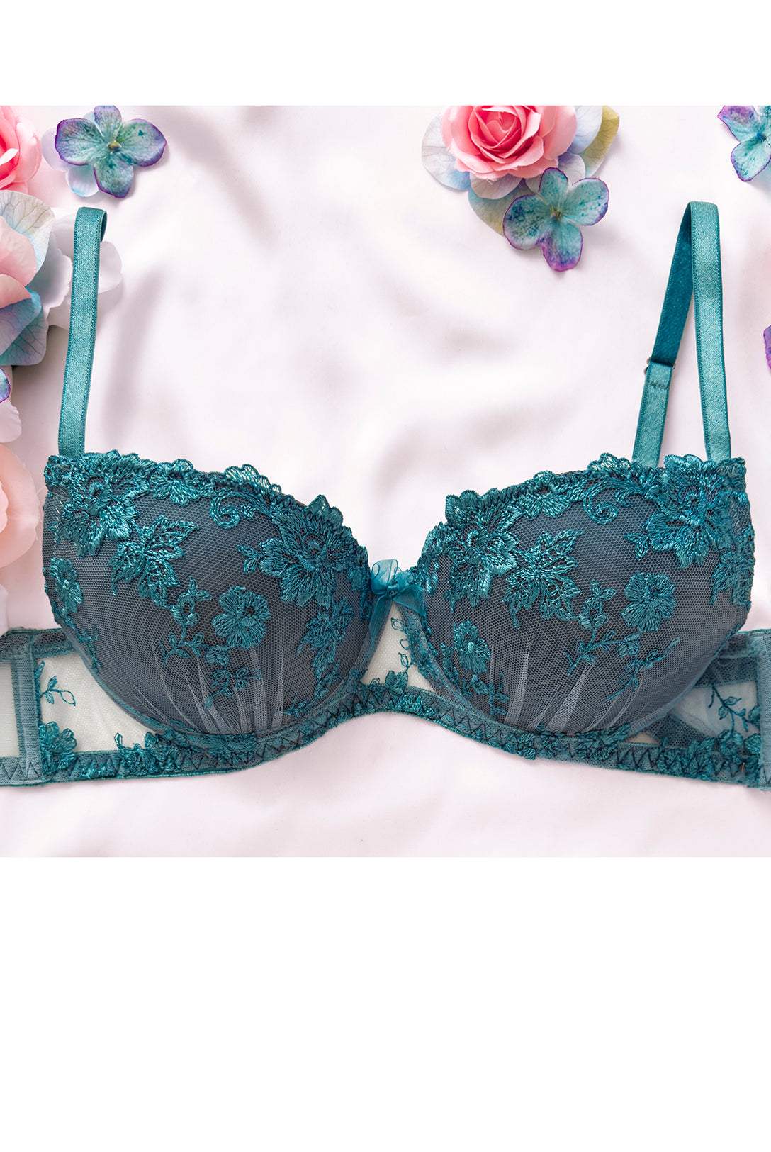 Reggiseno push-up realizzato interamente in pizzo arancio ruggine con fiori cordonati (disegno pazzesco), inserti luminosi (tutto è più bello quando brilla) e con base microretata. Fiocco centrale in raso in abbinamento.