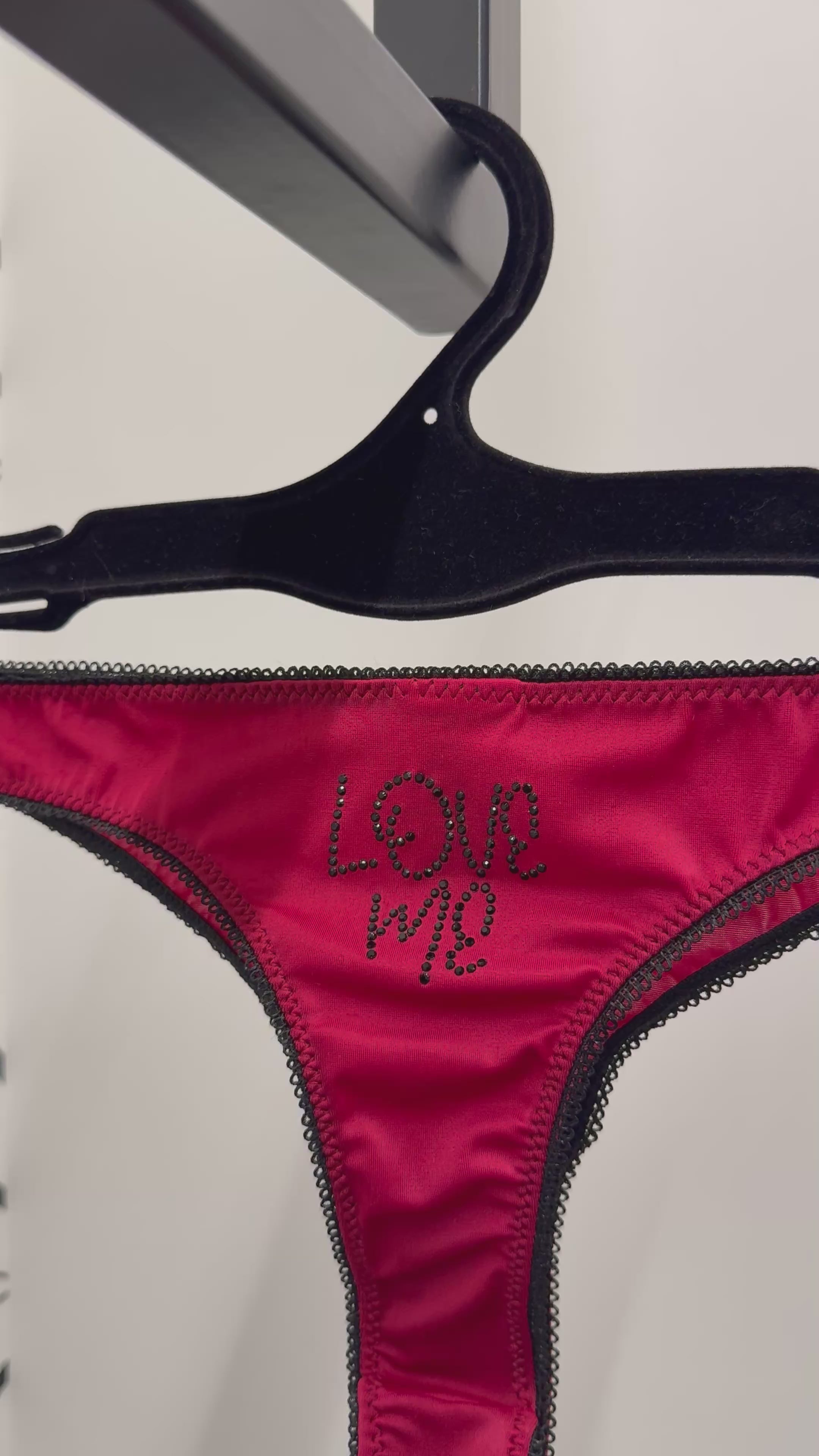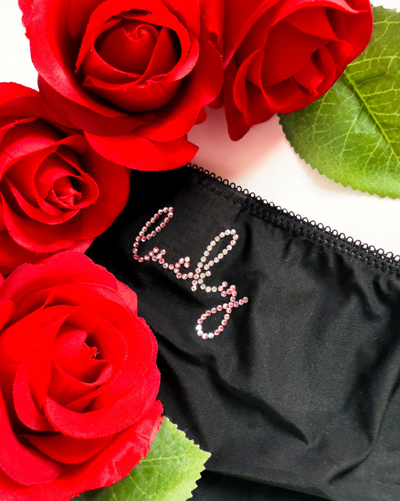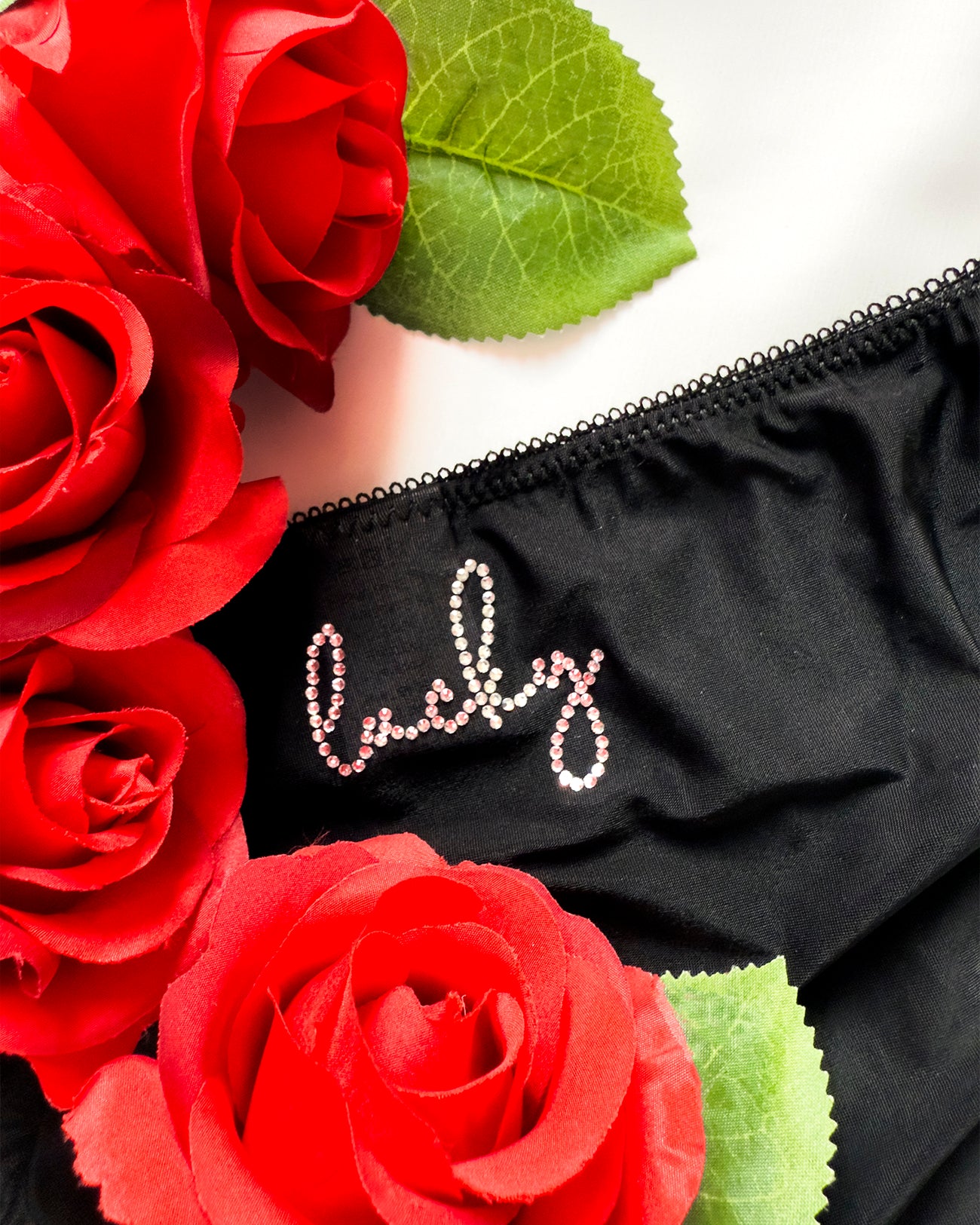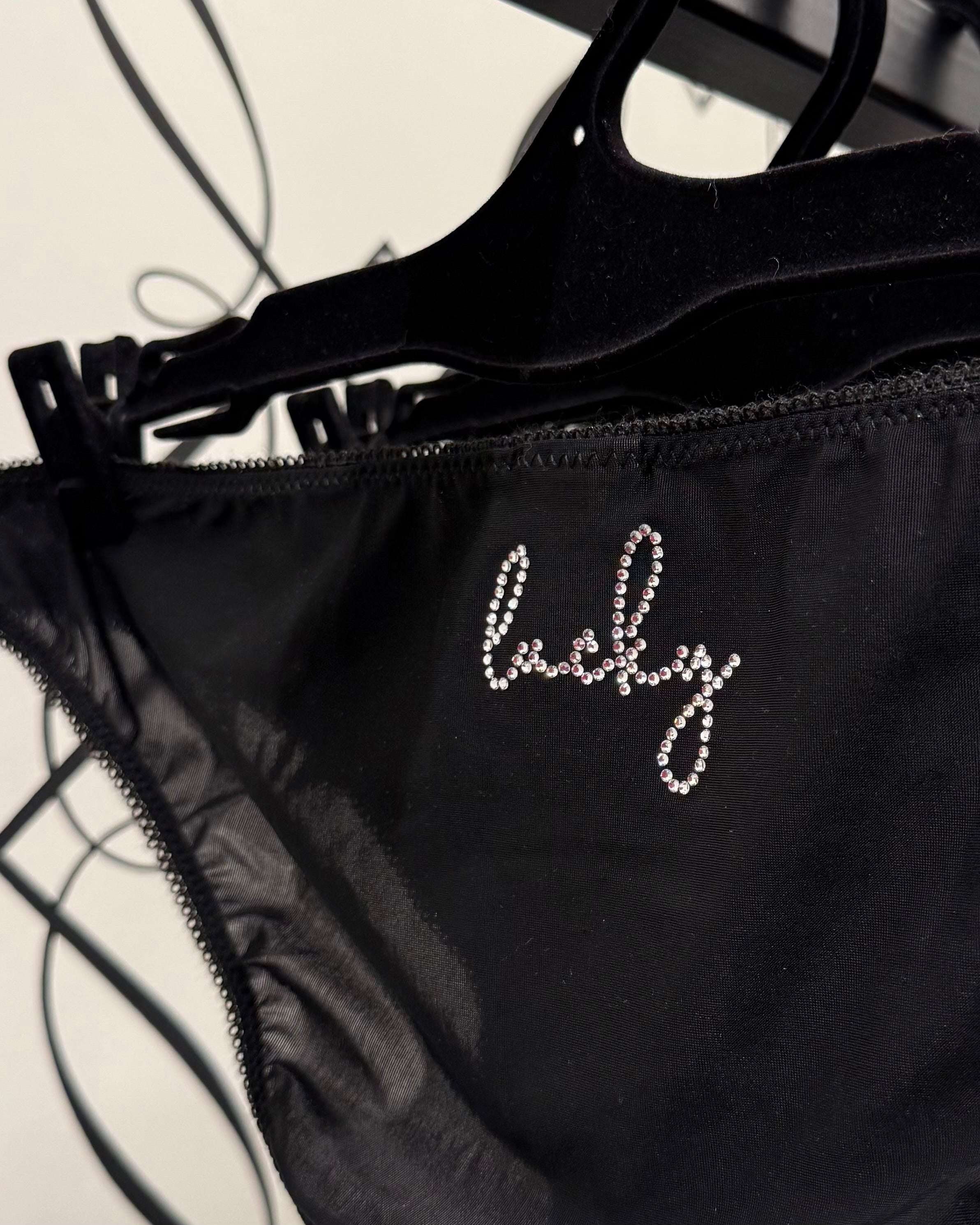 Slip a vita regolare in morbidissimo tessuto elasticizzato nero. Incantevole applicazione SUL RETRO in cristalli color brillante (di prima qualità per luminosità e resistenza) con scritta "LUCKY". Pattina in 100% cotone.