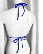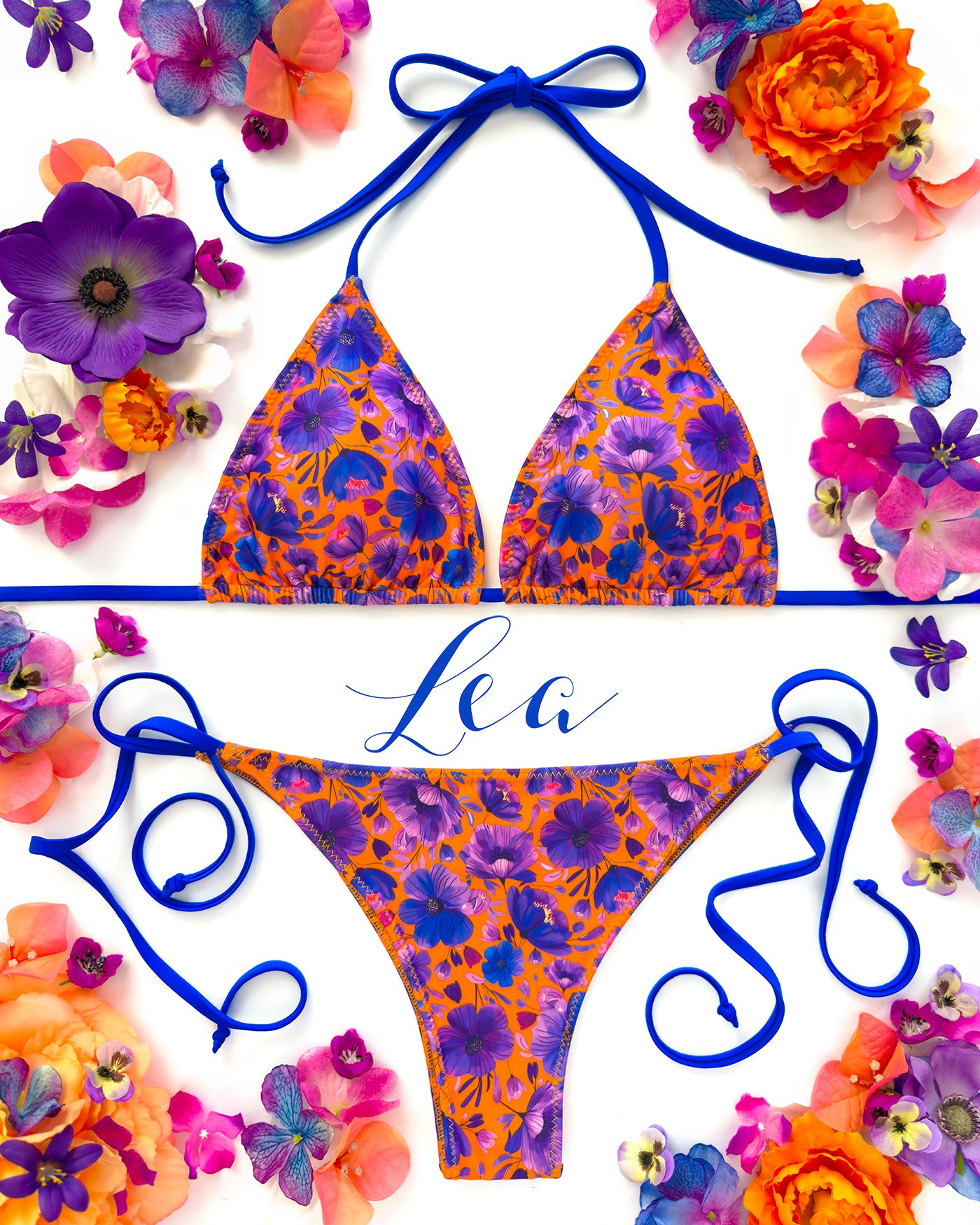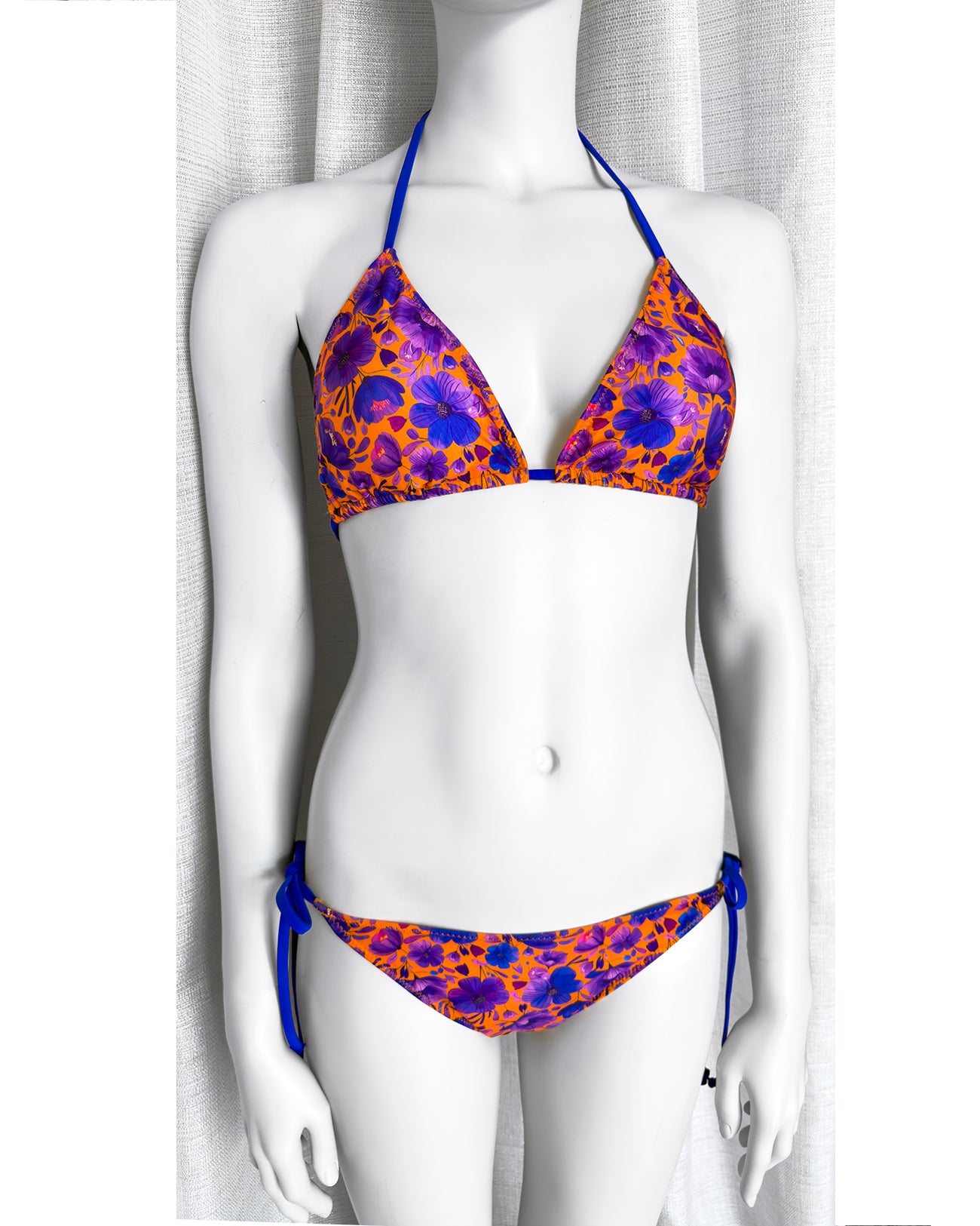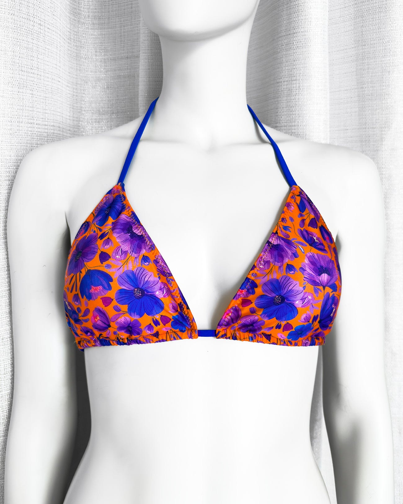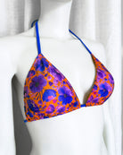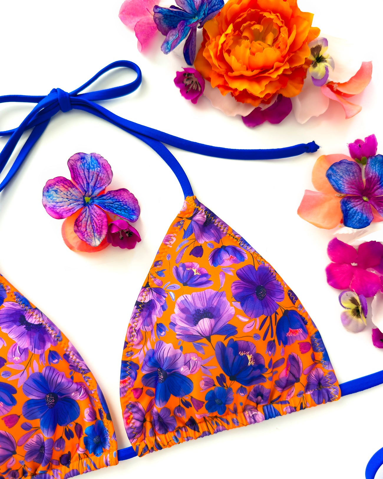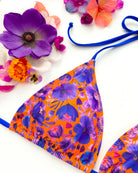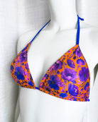 Triangolo da bagno con imbottitura estraibile in morbidissimo tessuto stampato con originalissima stampa a fiori con tutte le sfumature del blu elettrico e del viola ♥️. Lacci in tinta con la stampa.